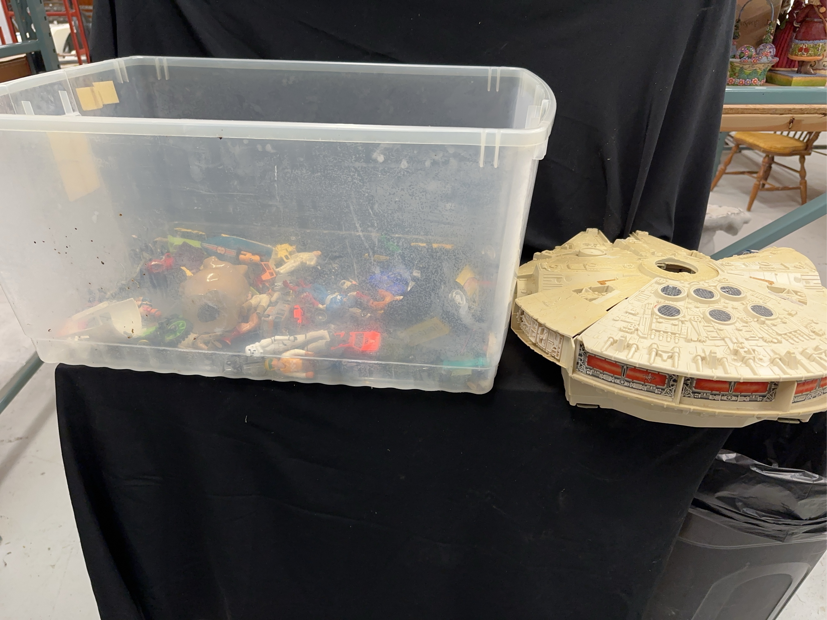 Variety of action figures including a Captain America figure and parts of other figures, die-cast cars of various models, a Star Wars Millennium Falcon and other assorted toys.