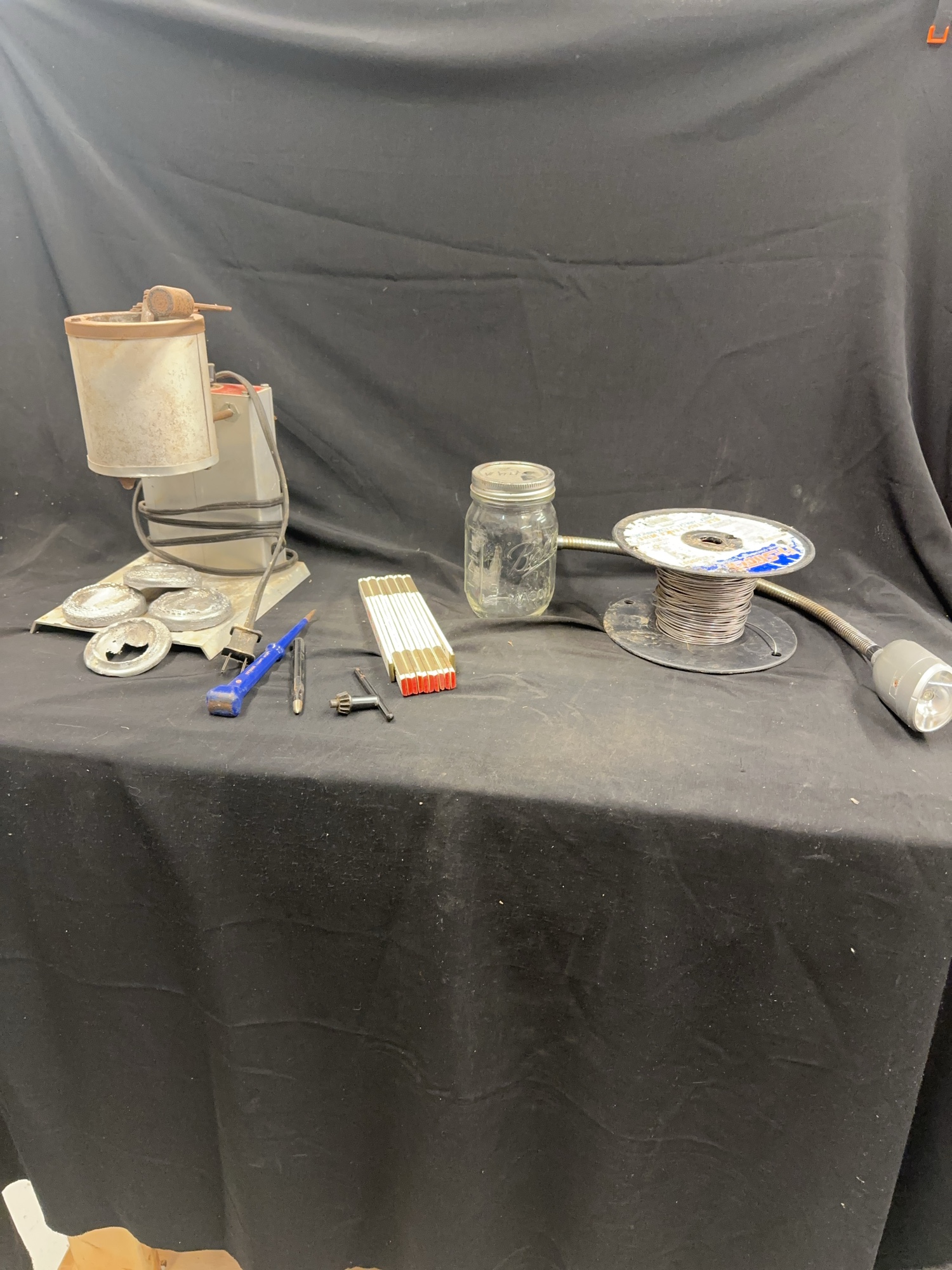 Includes a metal casting furnace with ingot molds, a partial spool of electric fence wire, a glass jar, a folding ruler, screwdriver, punch, and chuck key.