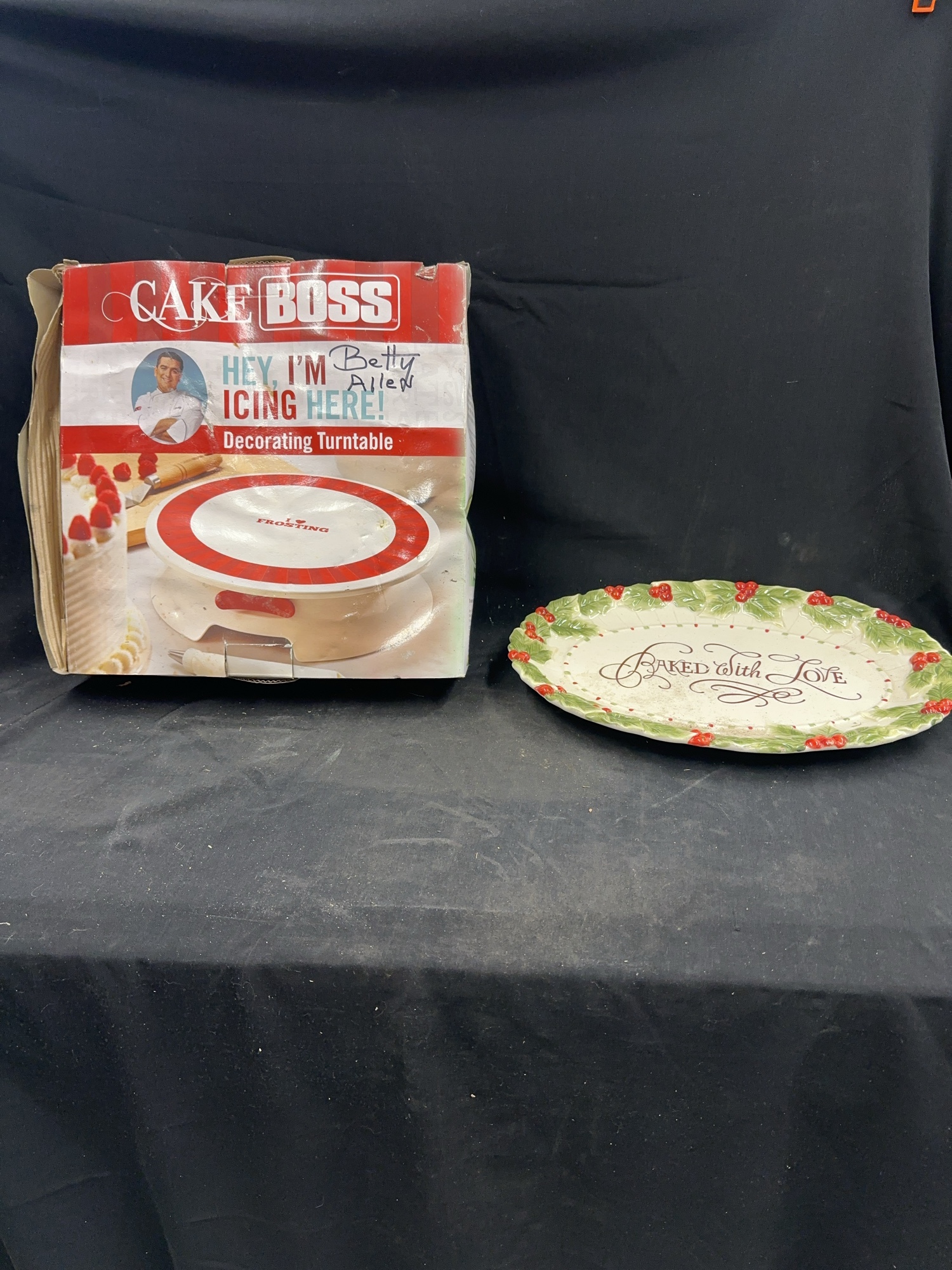 Cake Boss Decorating Turntable in original packaging. Also included is a Fitz and Floyd 'Baked with Love' Cookie Platter.