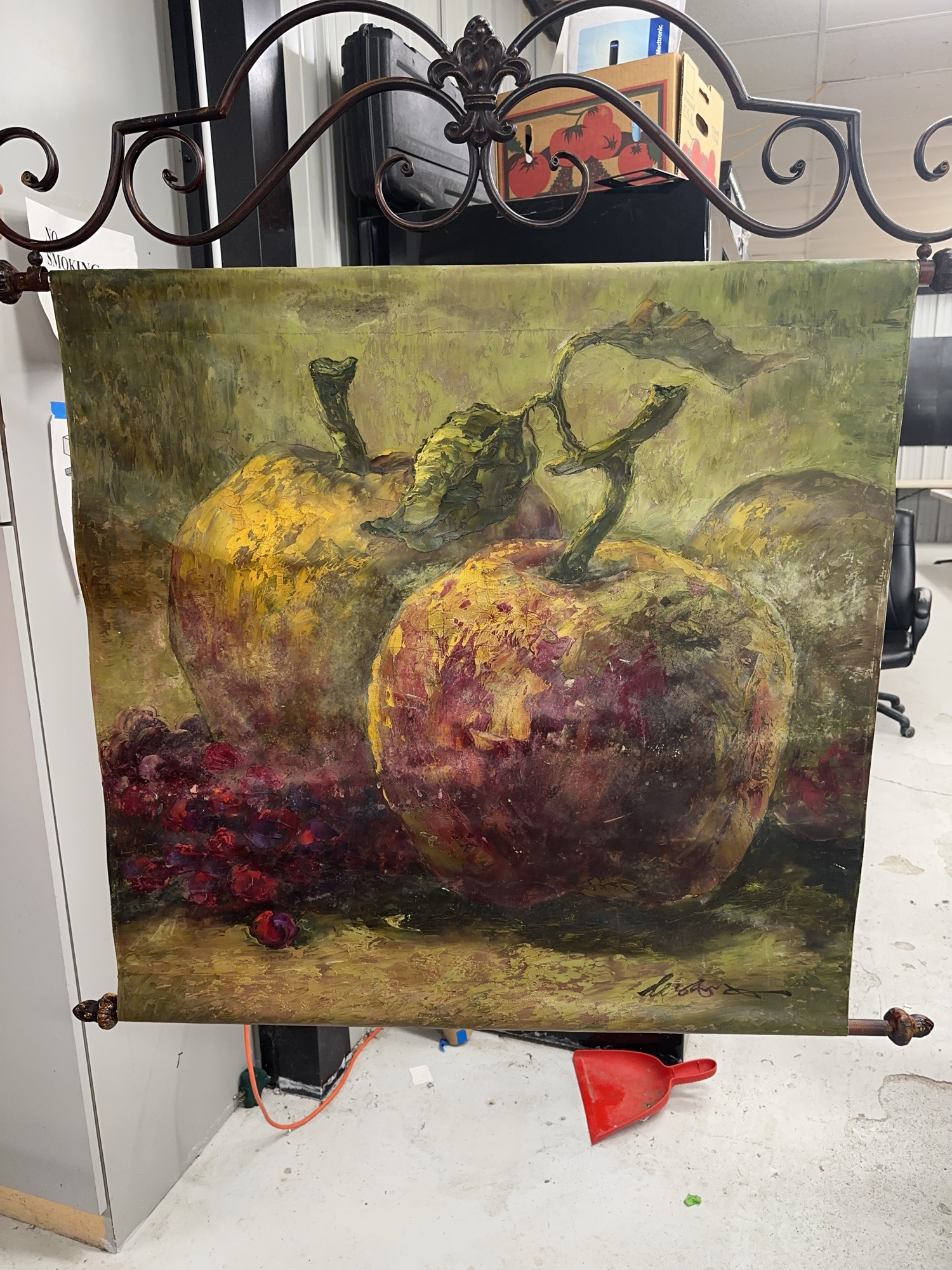Decorative canvas painting depicting a still life of apples and grapes, mounted within an ornate metal frame.