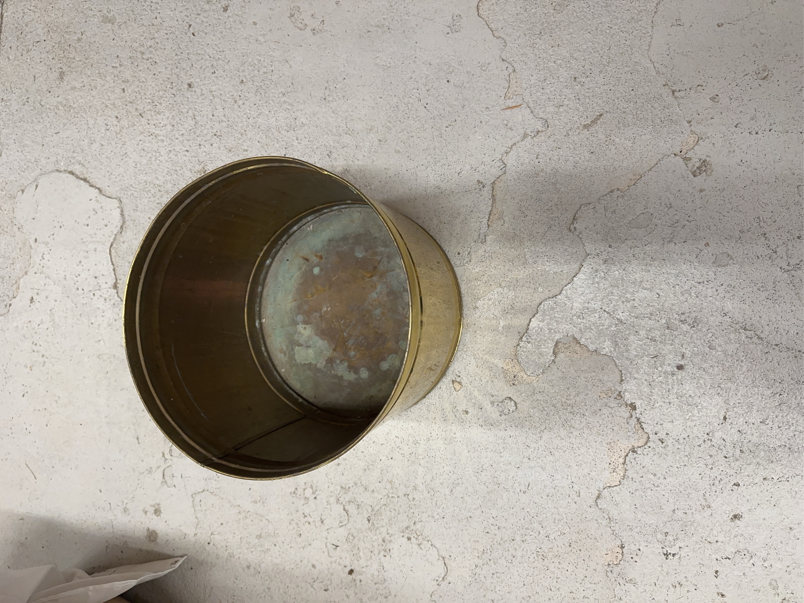 Solid brass planter container. Its round shape and smooth surface give it a sleek aesthetic.