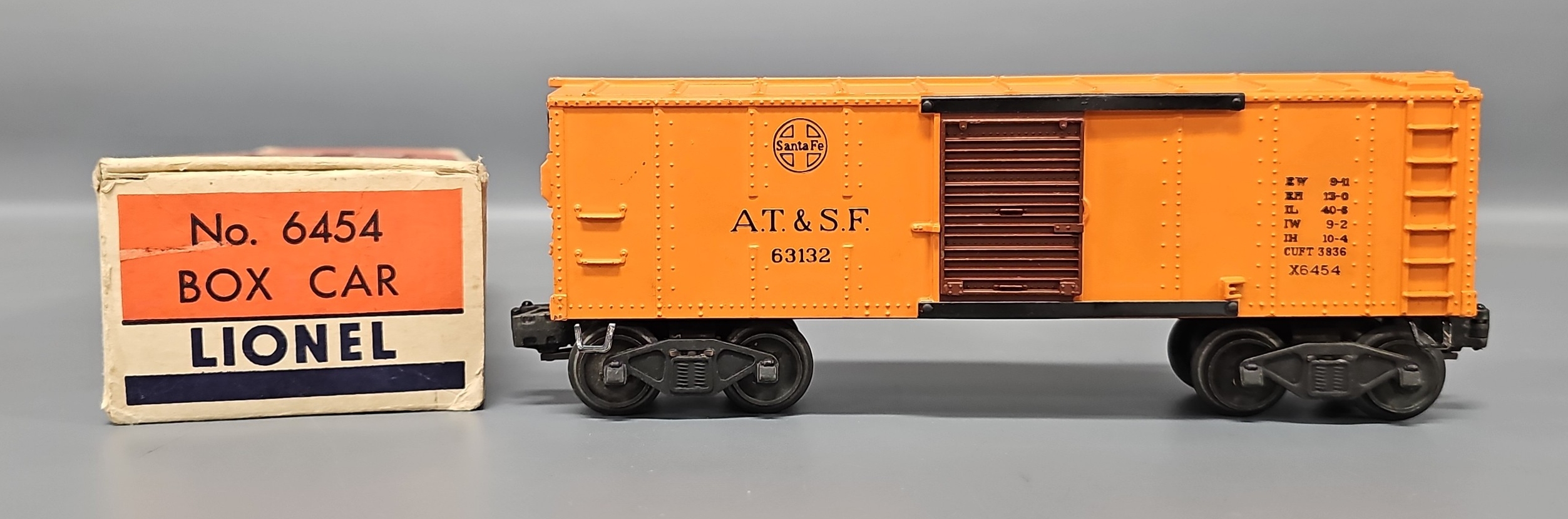 Lionel Postwar O 6454 ATSF Orange Box Car in Original Box. Car shows moderate run time and is C7-8 in a very good to excellent original box.
