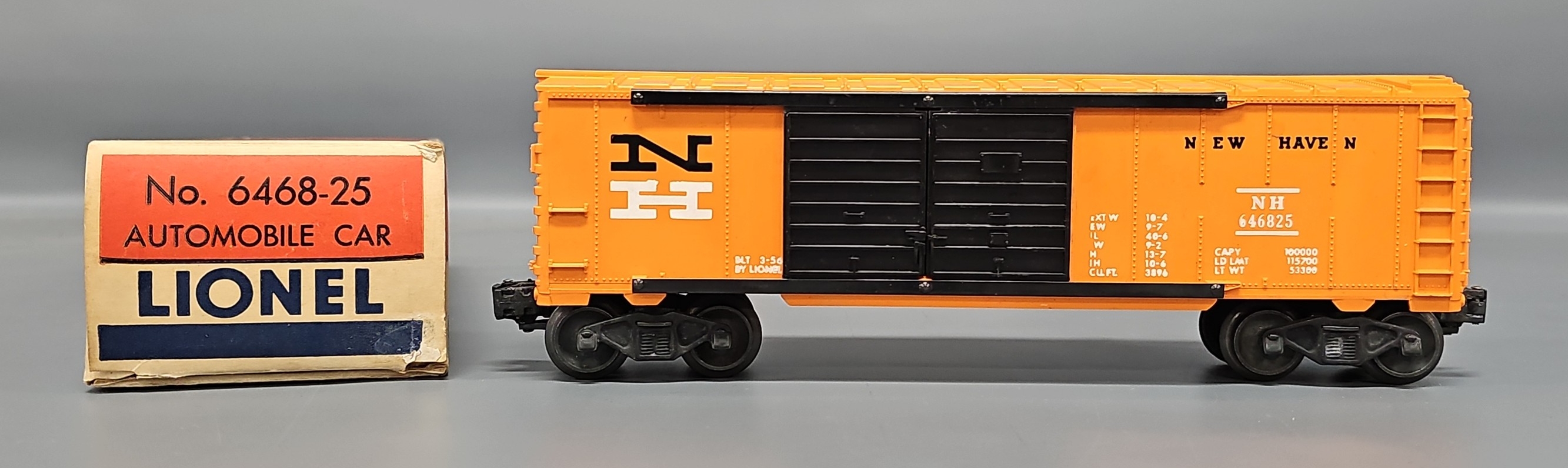 Lionel Postwar O 6468-25 New Haven Automobile Car in Original Box, car shows light run time and is C8 in an excellent original box.