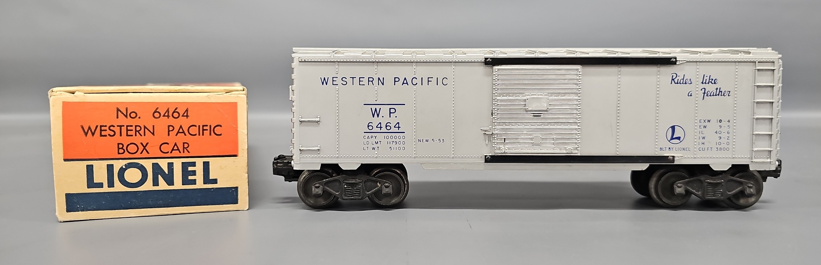 Lionel Postwar O 6464-1 Western Pacific Box Car in Original Box, car shows moderate run time and C7-8 in an excellent original box.