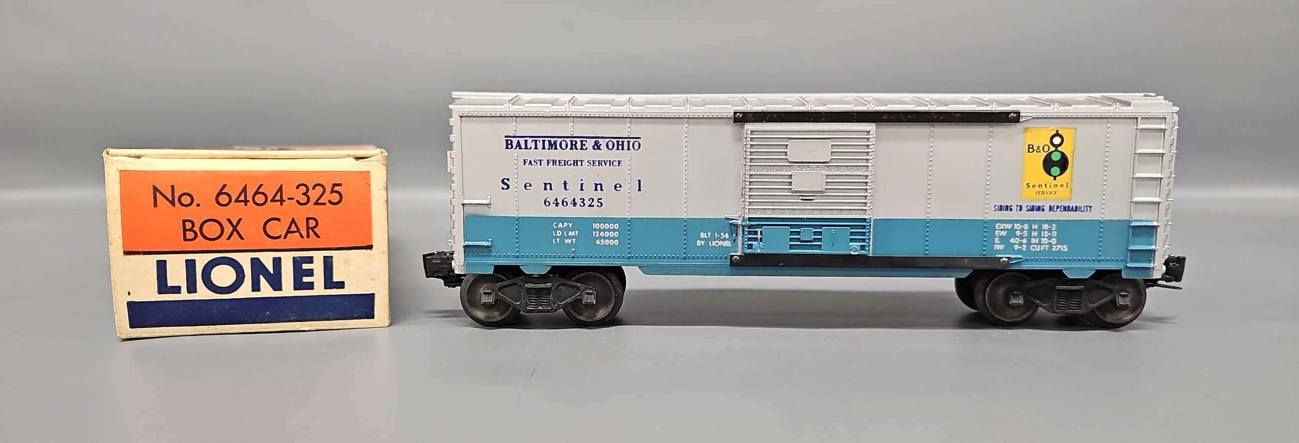 Unrun Lionel Postwar O 6464-325 Baltimore & Ohio Box Car in Original Box, car has never been run but shows signs of being handled, C8 in a very good original box that has repairs to one end flap.