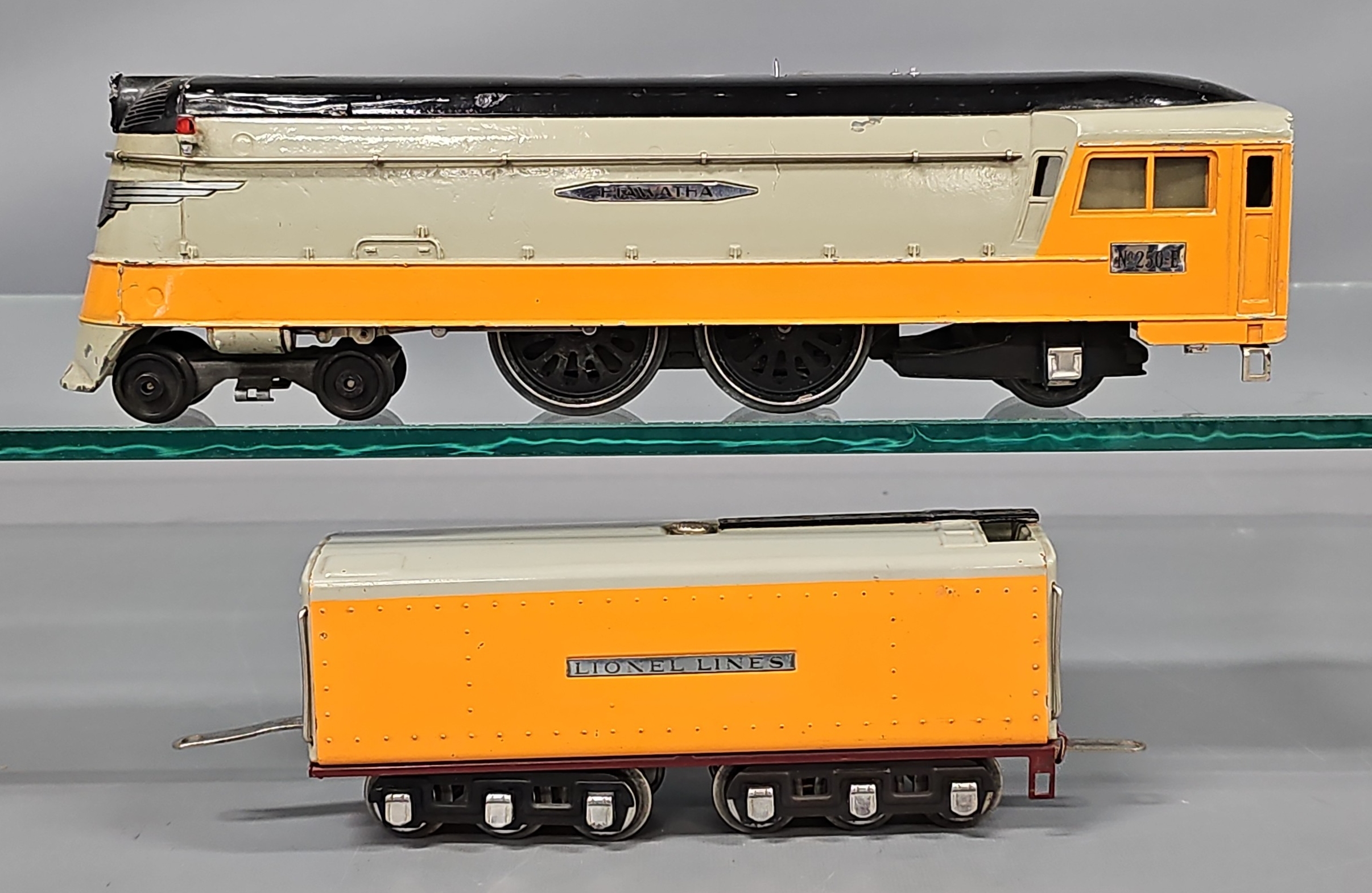 Lionel Prewar O Gauge 250E Hiawatha Die Cast Steam Locomotive with 250W Tender for passenger cars as it has a draw bar on both ends and no coupler. The locomotive has been tested and runs in forward, neutral and reverse with headlight. The tender whistle does not work and it sounds as if there may be a few very small pieces of something floating around in the tender, C6-7.