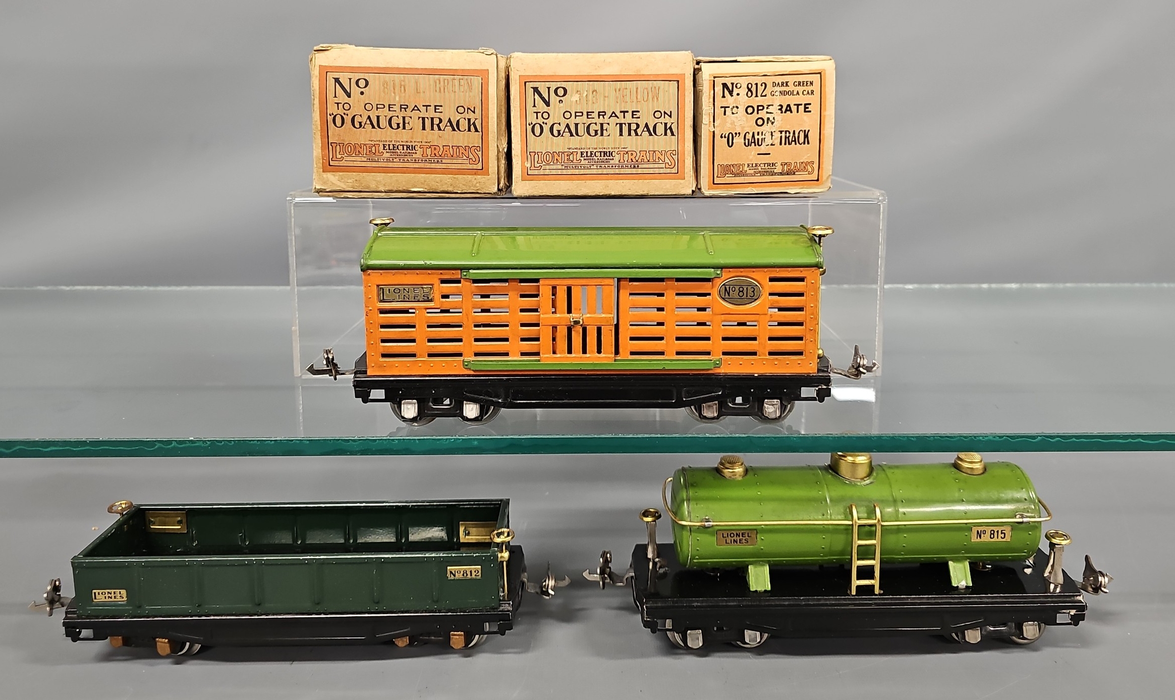 Three Lionel O Gauge Train Cars in Original Boxes to include 812 dark green gondola that is possibly unrun and C7+, orange and green 813 stock car that shows little to no run time and is C7-8 and a pea green 815 tank car that shows very light run time and is C6+. The original boxes are missing inner flaps but have all six end flaps intact between the three.