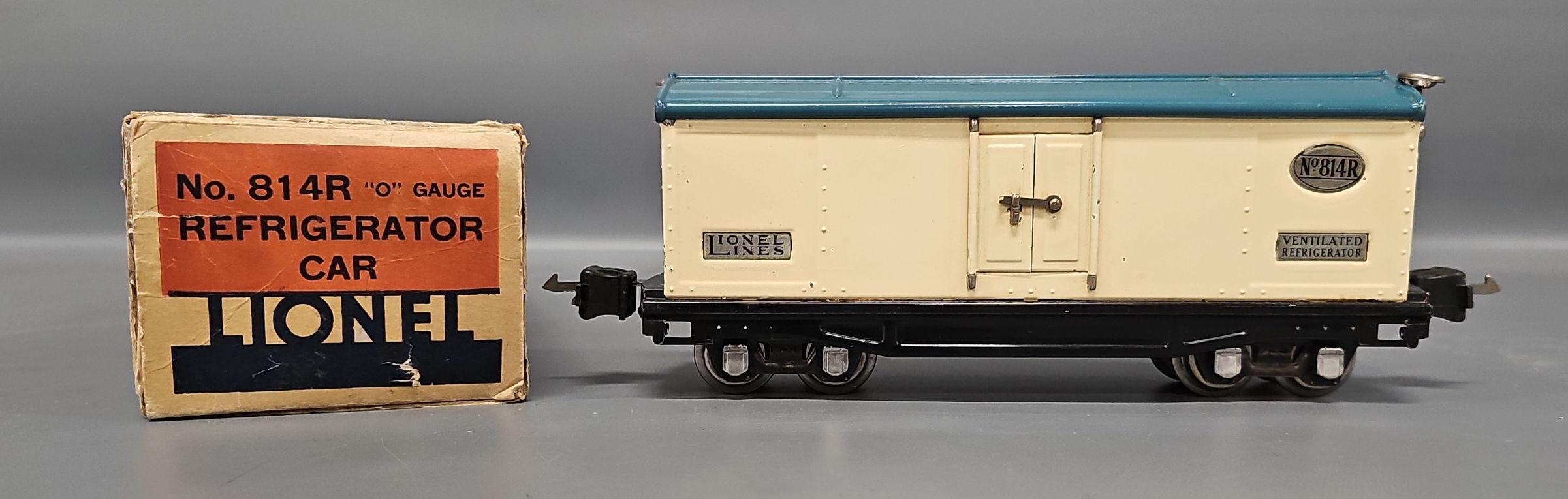 Lionel Prewar O Gauge All Nickel Trim 814R Refrigerator Car in Original Box, car shows light to moderate run time and is C7-8 with all nickel trim and journals. Comes in a rough original box with one end flap that has a price sticker from Bloomingdales New York for$2.69, it was stock number M5 66E