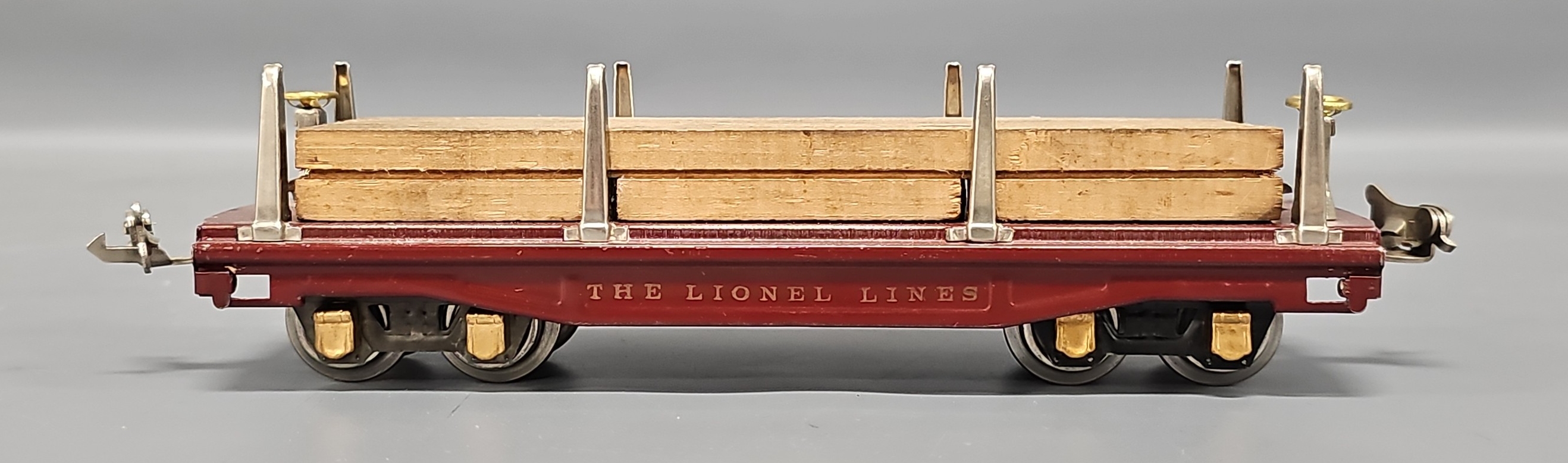 Beautiful Lionel Prewar O Gauge Wine or Maroon 811 Flat Car with Lumber Load. The car shows very light run time and is super nice and clean with nickel stakes and brake stands, copper journals and brass brake wheels, C7+. Comes with an original lumber load.