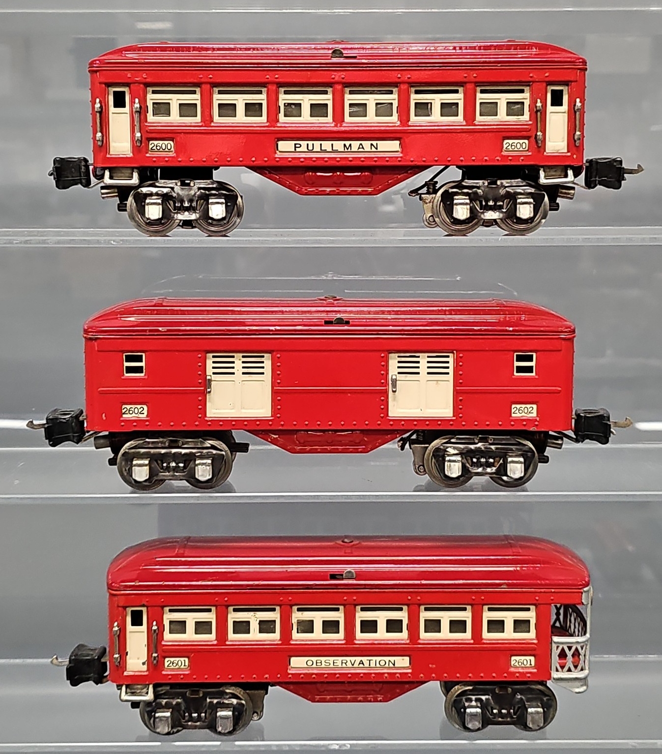 Lionel Prewar O Gauge Red Comet Passenger Cars to include 2600 Pullman, 2601 observation and 2602 baggage cars, C6-7.