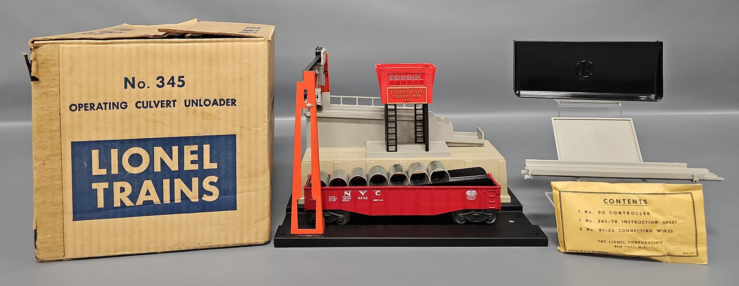 Lionel Postwar O 345 Operating Culvert Unloader Set in Original Box. Set comes with an unrun 6342 New York Central culvert gondola car with seven pipes and a 90 controller, unloader with connecting ramp to the 342 set, operating packet that is missing the 90 controller and also comes with a 160 bin in a very good to excellent original box with original inserts.