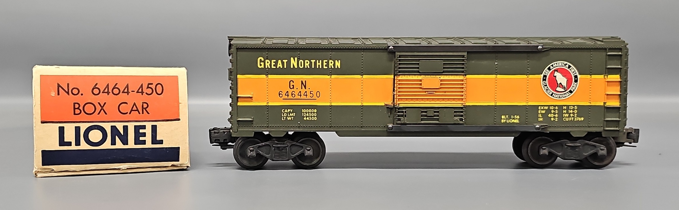Lionel Postwar O 6464-450 Great Northern Box Car win Original Box, C8 in a brick original box.