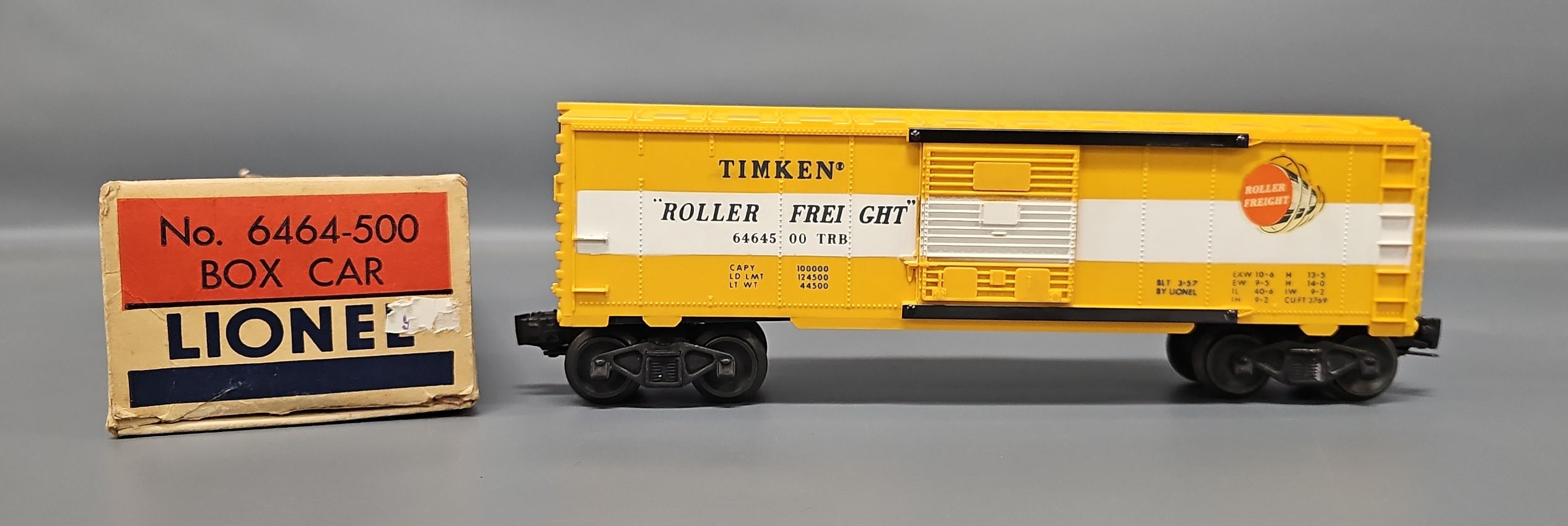 Lionel Postwar O type IIb Buttercup Yellow 6464-500 Timken Box Car in Original Box, C8+ in a good original box.