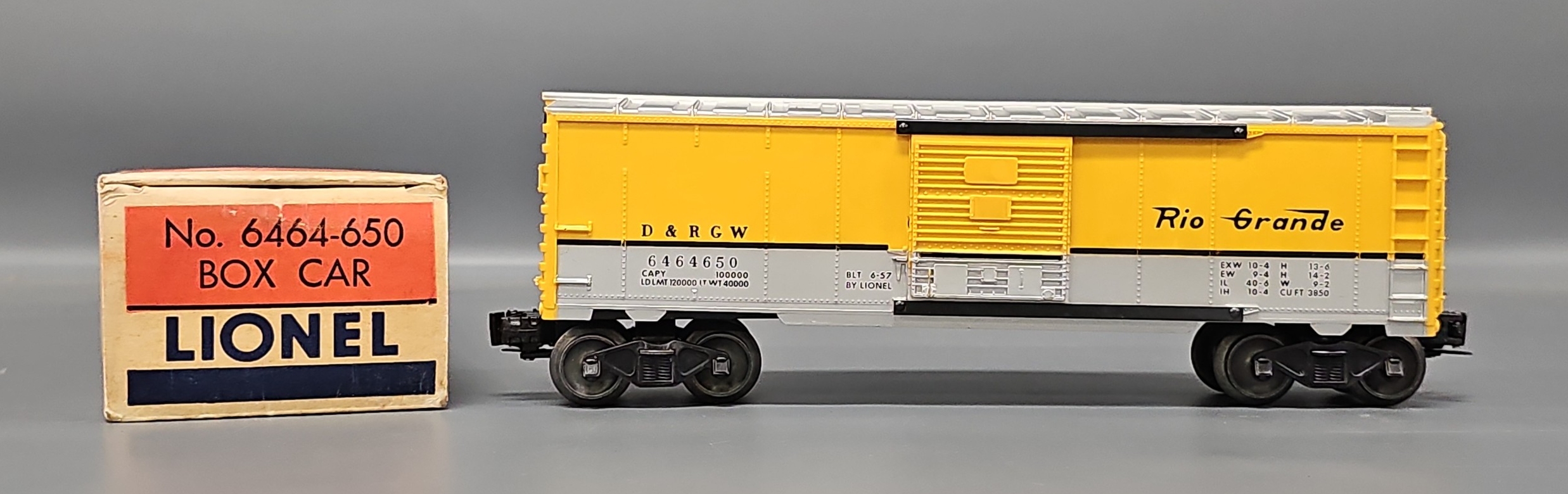 Lionel Postwar O type IIb 6464-650 Rio Grande Box Car in Original Box, car shows very light run time, possibly none at all and comes in a very nice box that is complete, solid and square but has a few minor attributes that keeps it out of my 'brick' category.