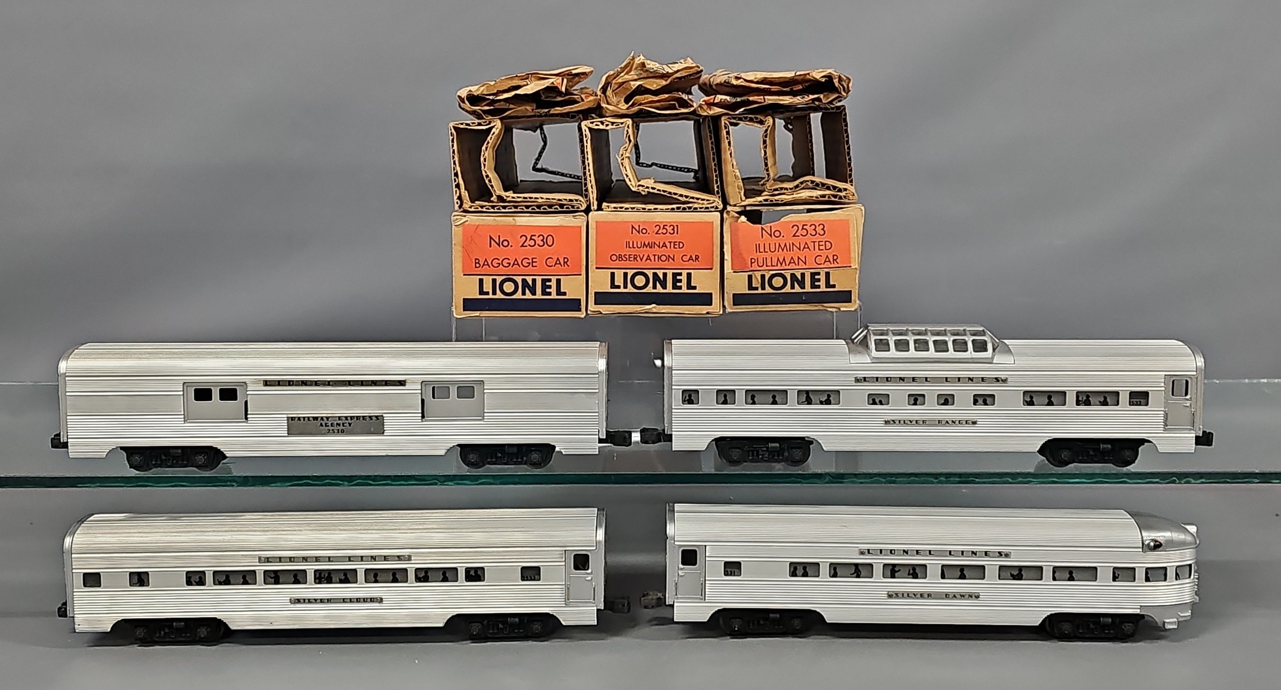 Lionel Postwar O 2530 Railway Express Agency baggage, 2531 Silver Dawn observation, 2532 Silver Range vista dome and 2533 Silver Cloud Pullman Extruded Aluminum Passenger Cars with matching hex-head screws. Cars show light run time and are C7-8. Comes with three original boxes with original inserts and Lionel wrap. There are two very nice boxes, 2530 and 2531 plus a 2532 that is missing flaps from both ends.