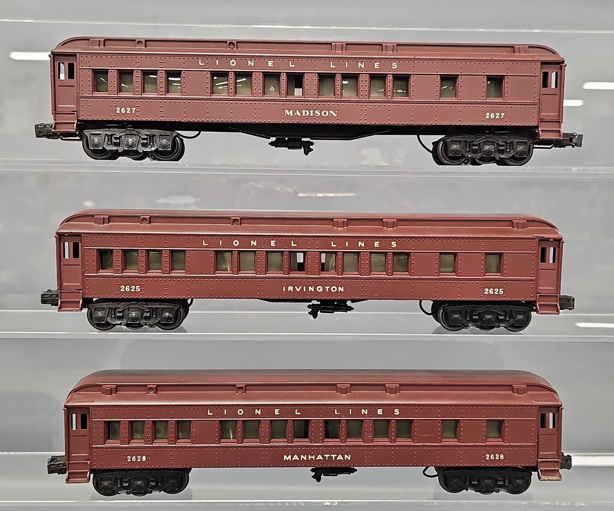 Matched Set of Lionel Postwar O Heavyweight Madison Cars to include 2625 Irvington, 2627 Madison and 2628 Manhattan, C6-7 with curled window strips.