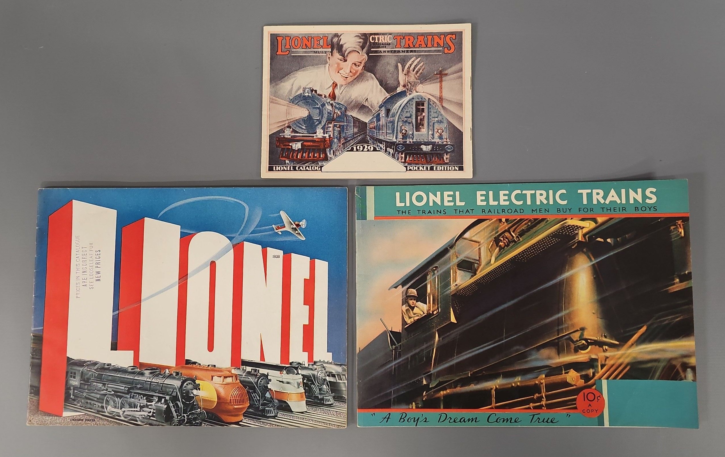 Three Nice Original Lionel Prewar Consumer Catalogs to include 1929 pocket edition, 1932 and 1938, all three are in excellent condition.