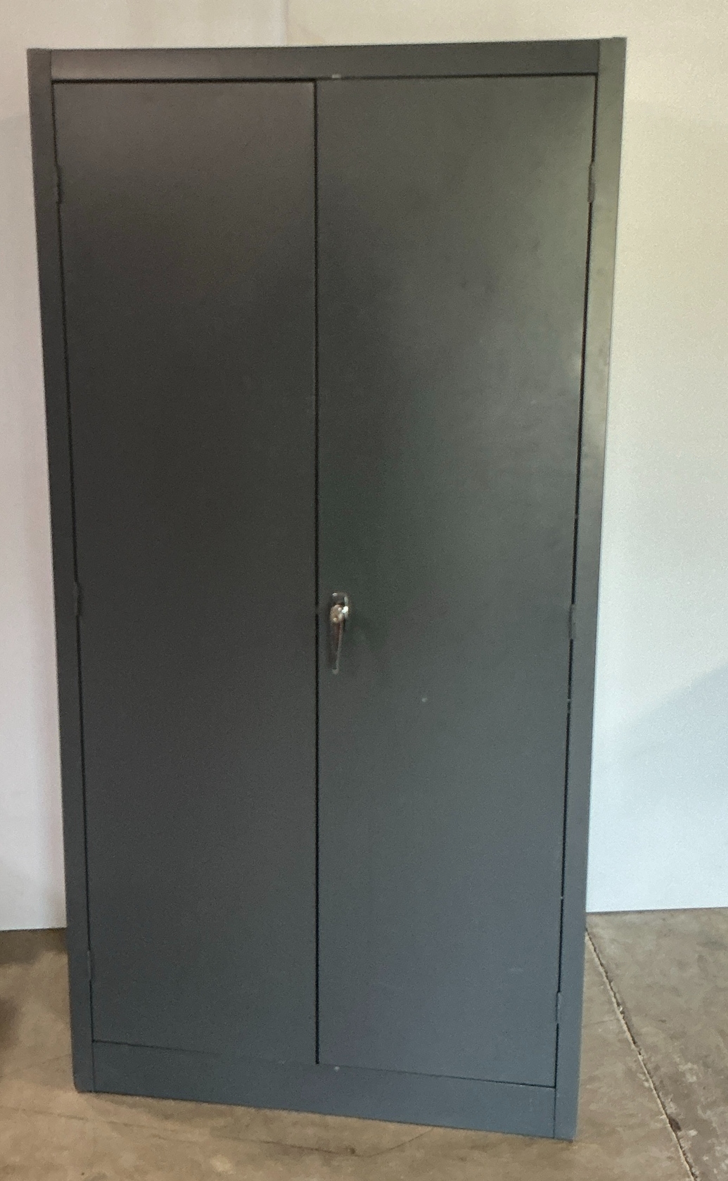This is a gray, steel storage cabinet with two doors and a key lock. Inside, it has multiple shelves for storing a variety of items. 72 x 36 x 24 in.