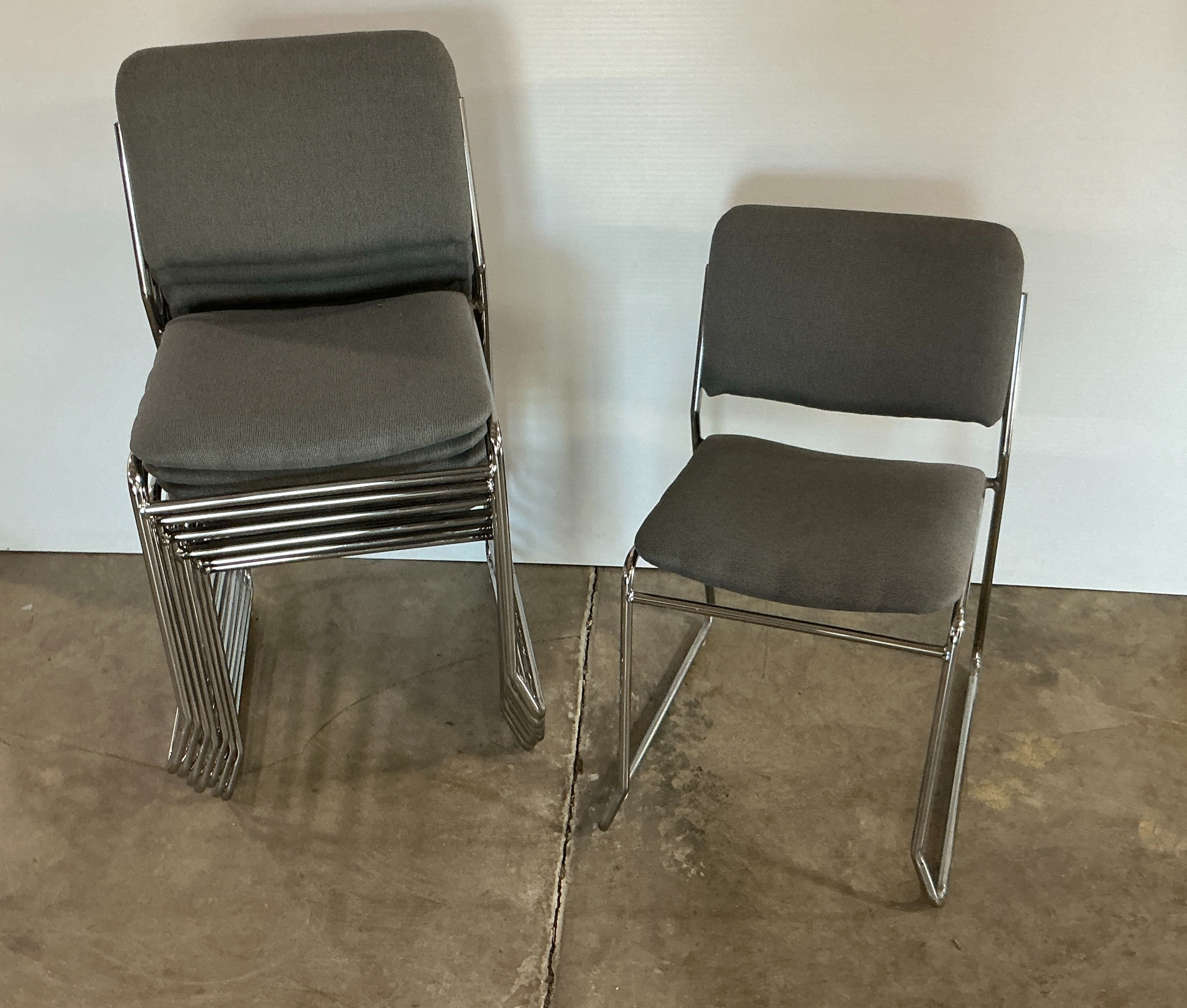 This lot contains eight stackable chairs, each with a gray upholstered seat and backrest, and a sturdy chrome frame. 30 in. tall
