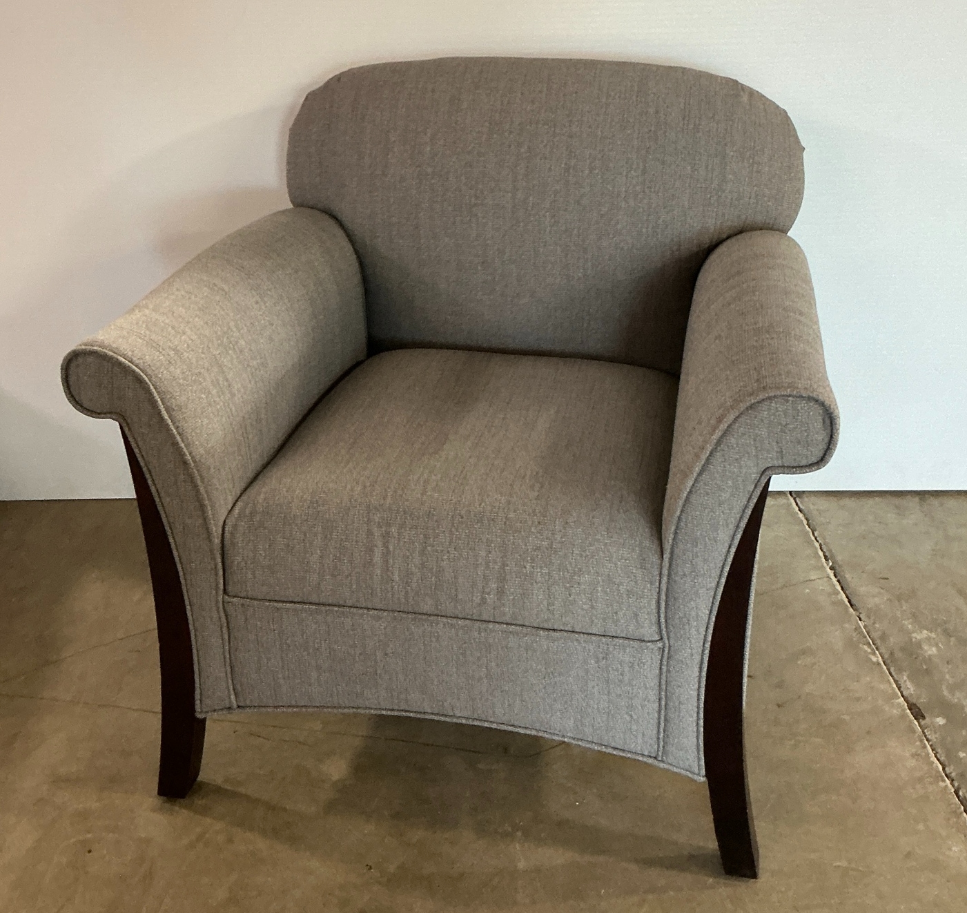 Comfortable armchair featuring a neutral, textured fabric upholstery, a curved back design, and dark wood legs. 32 x 29 x 29 in.