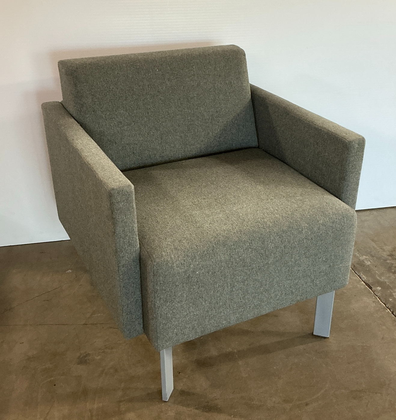 Comfortable armchair featuring gray upholstery and a modern design with clean lines and silver legs. 32 x 28 x 30 in.