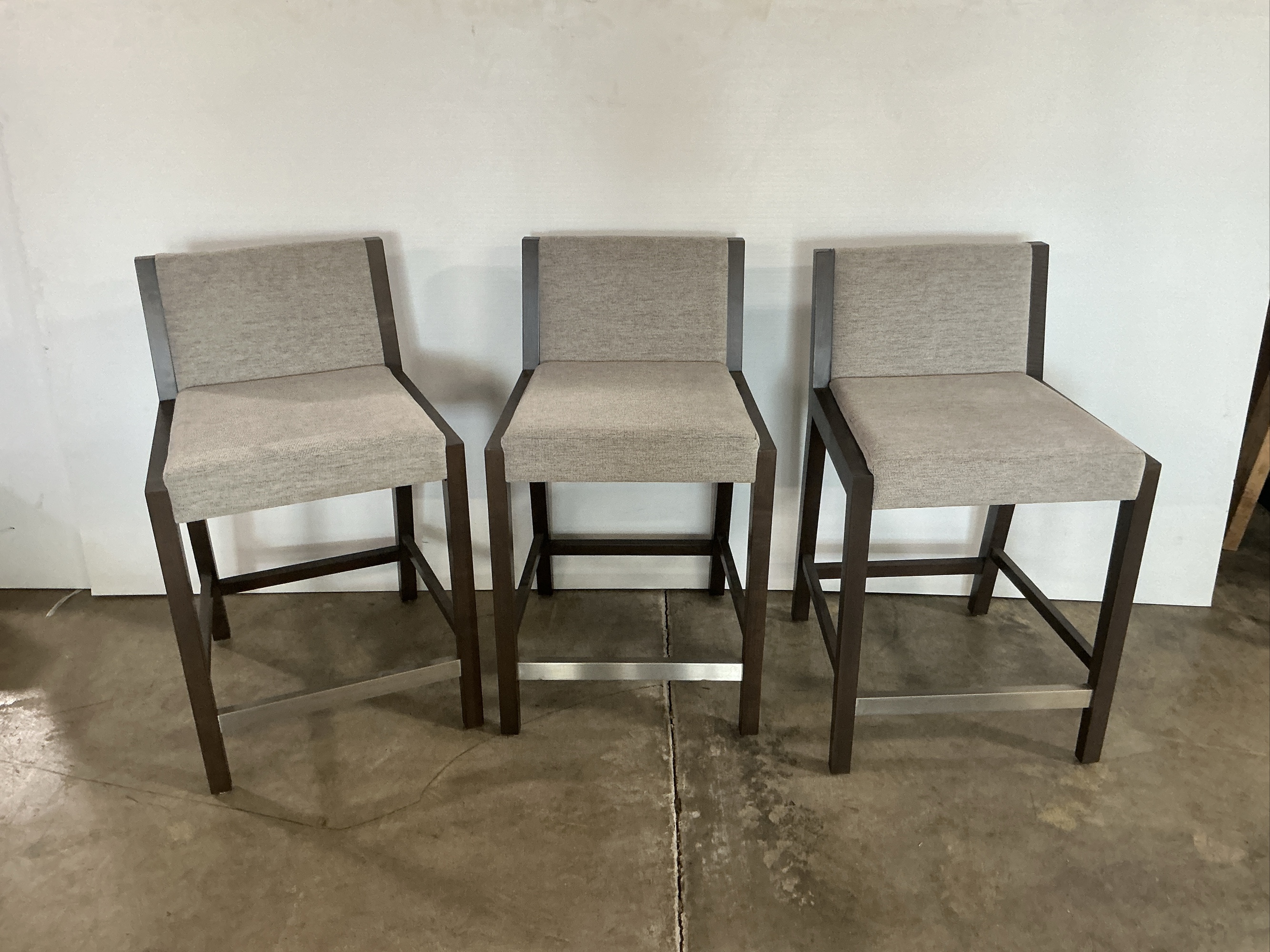 This is a set of three matching bar stools. They feature a contemporary design with dark-colored frames and upholstered seats in a neutral tone. 31 x 17 x 17 in.
