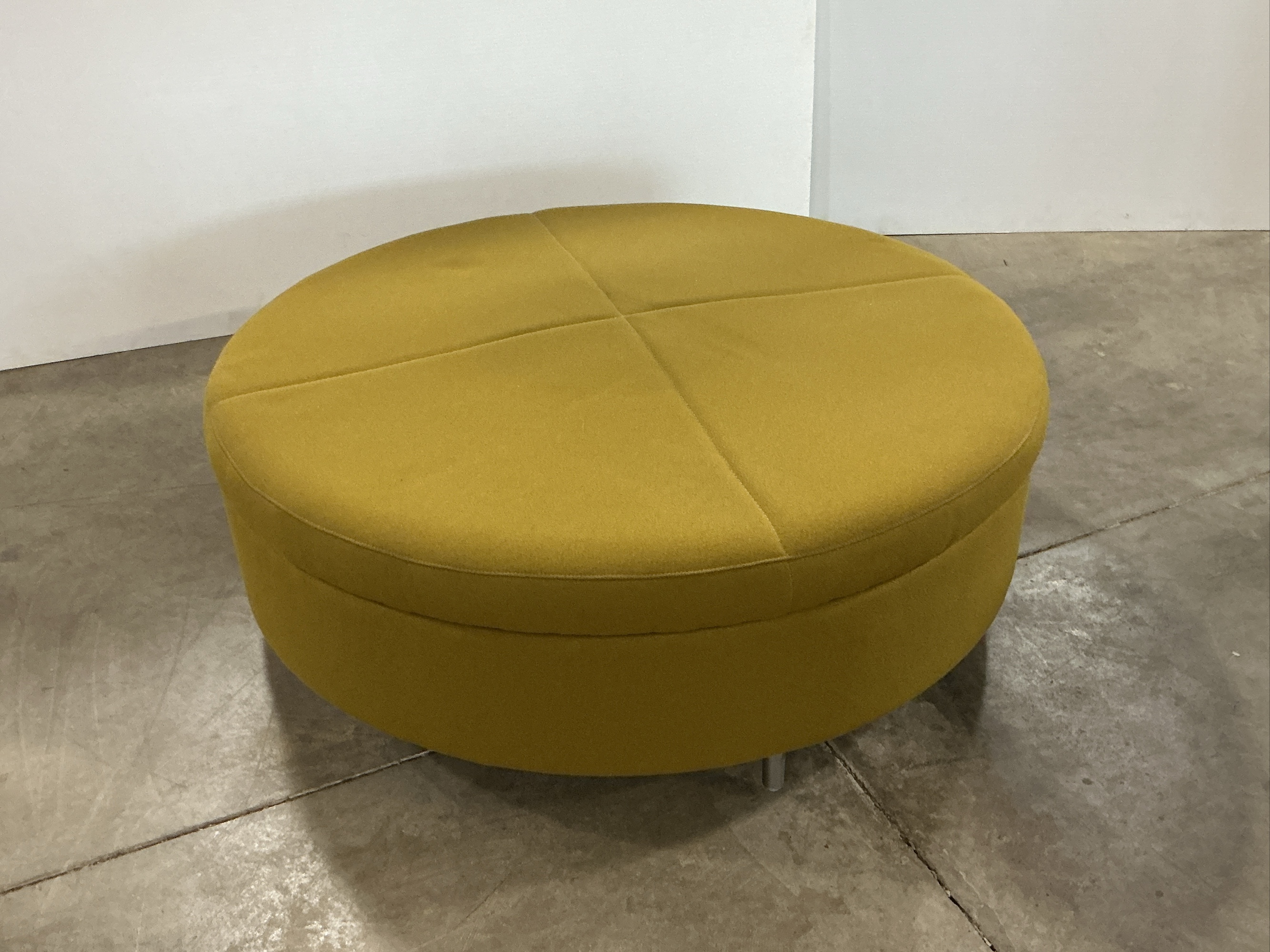 Round mustard yellow ottoman, perfect for use as a footrest or extra seating. 18 x 48 in.