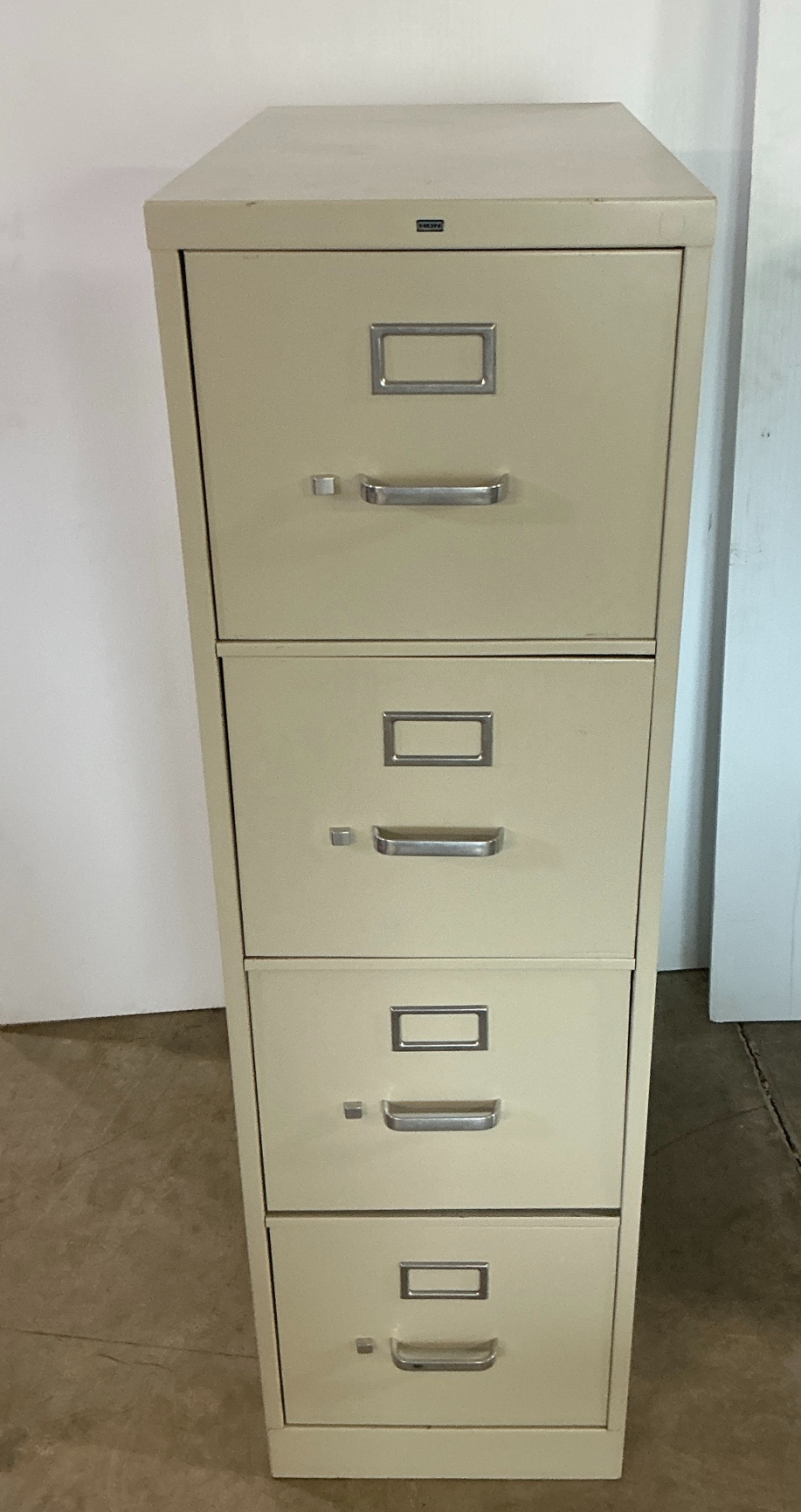 Tan colored steel filing cabinet featuring four drawers. Great for office or home organization. 52 x 15 x 27 in.