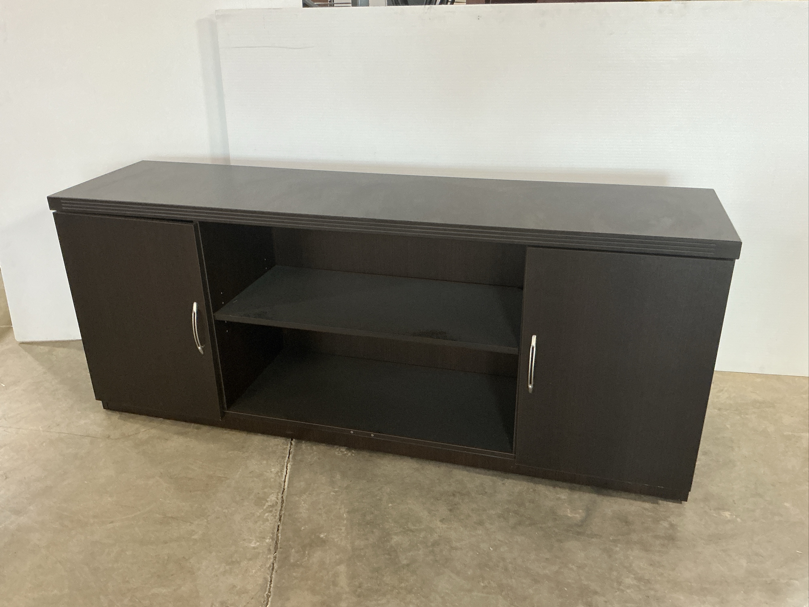 Dark brown media console with cabinet doors and shelving. Offers storage and display space. 30 x 72 x 18 in.