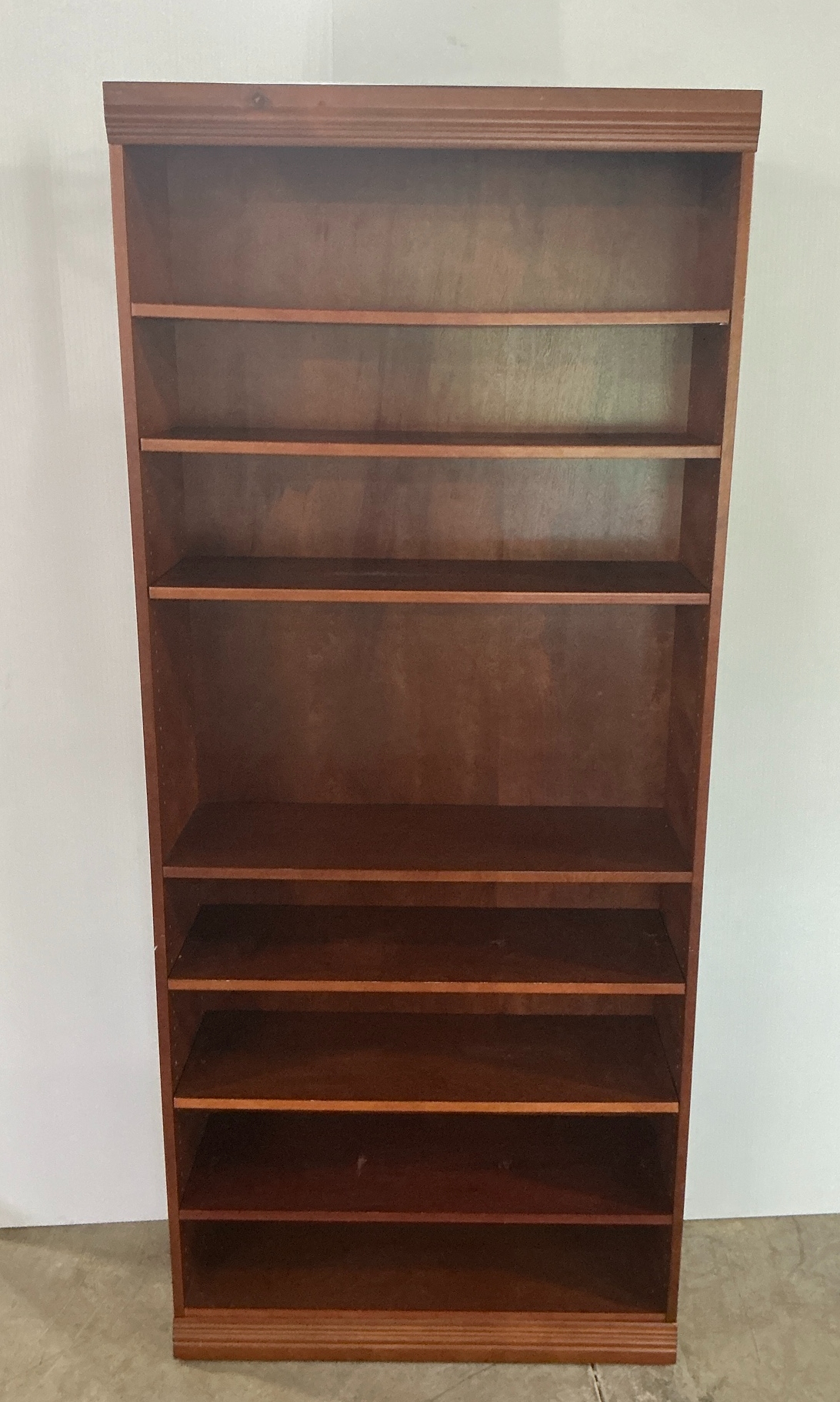 Wooden bookcase featuring multiple adjustable shelves. A practical storage solution for any home or office. 84 x 36 x 12 in.