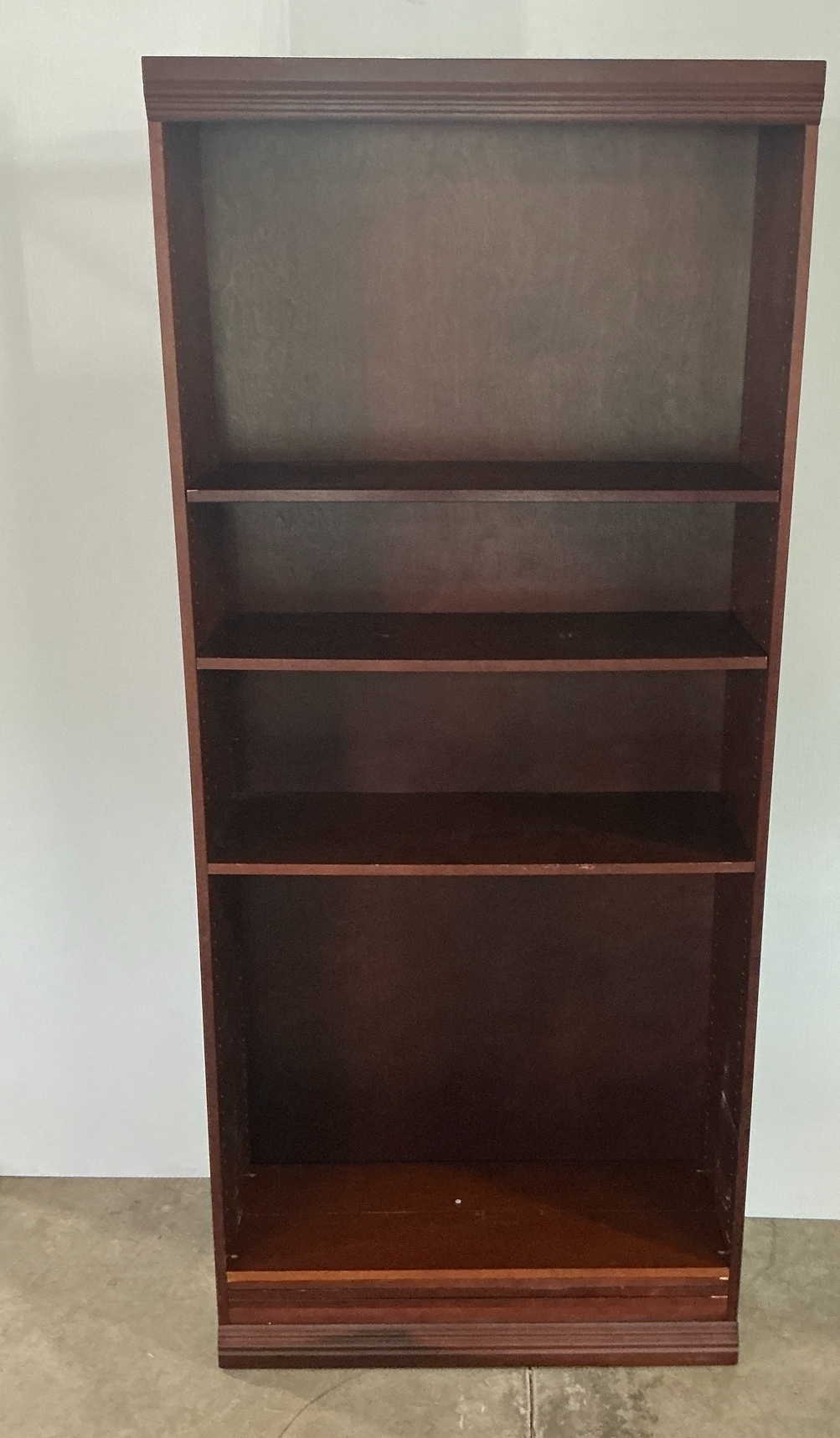 A sturdy wooden bookcase featuring a rich mahogany-style finish and adjustable shelves. There are extra shelves but no pegs. 84 x 36 x 12 in.