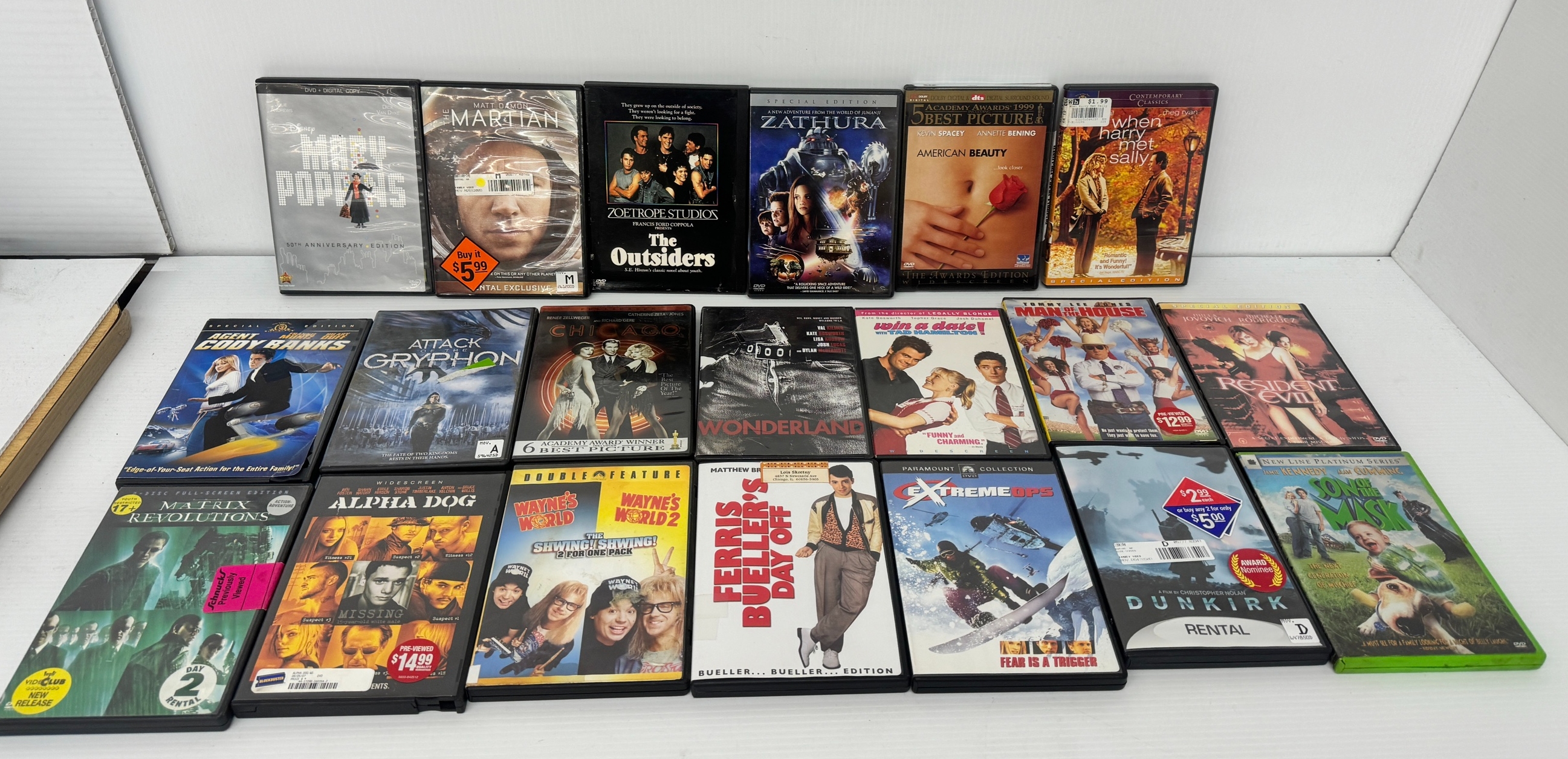 This lot includes a variety of DVD movies, featuring popular titles such as Resident Evil, American Beauty, Ferris Bueller's Day Off, Tommy Lee Jones Man of the House, Dunkirk, Extreme Ops and more!