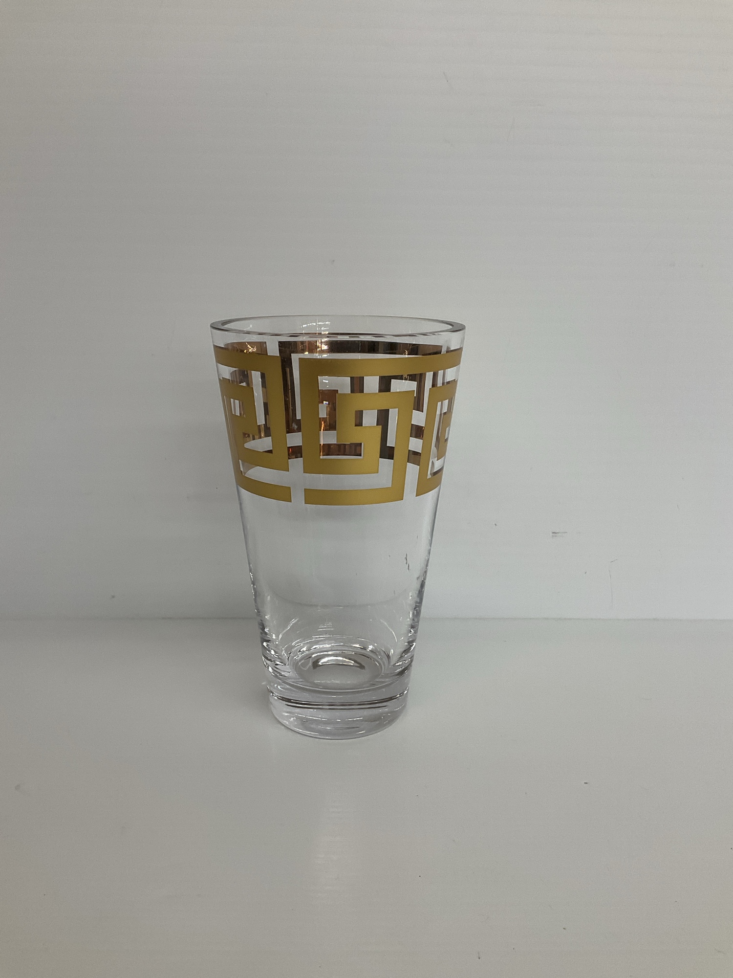 Clear glass vase, decorated with a gold geometric pattern near the top rim. 10 x 6 in.