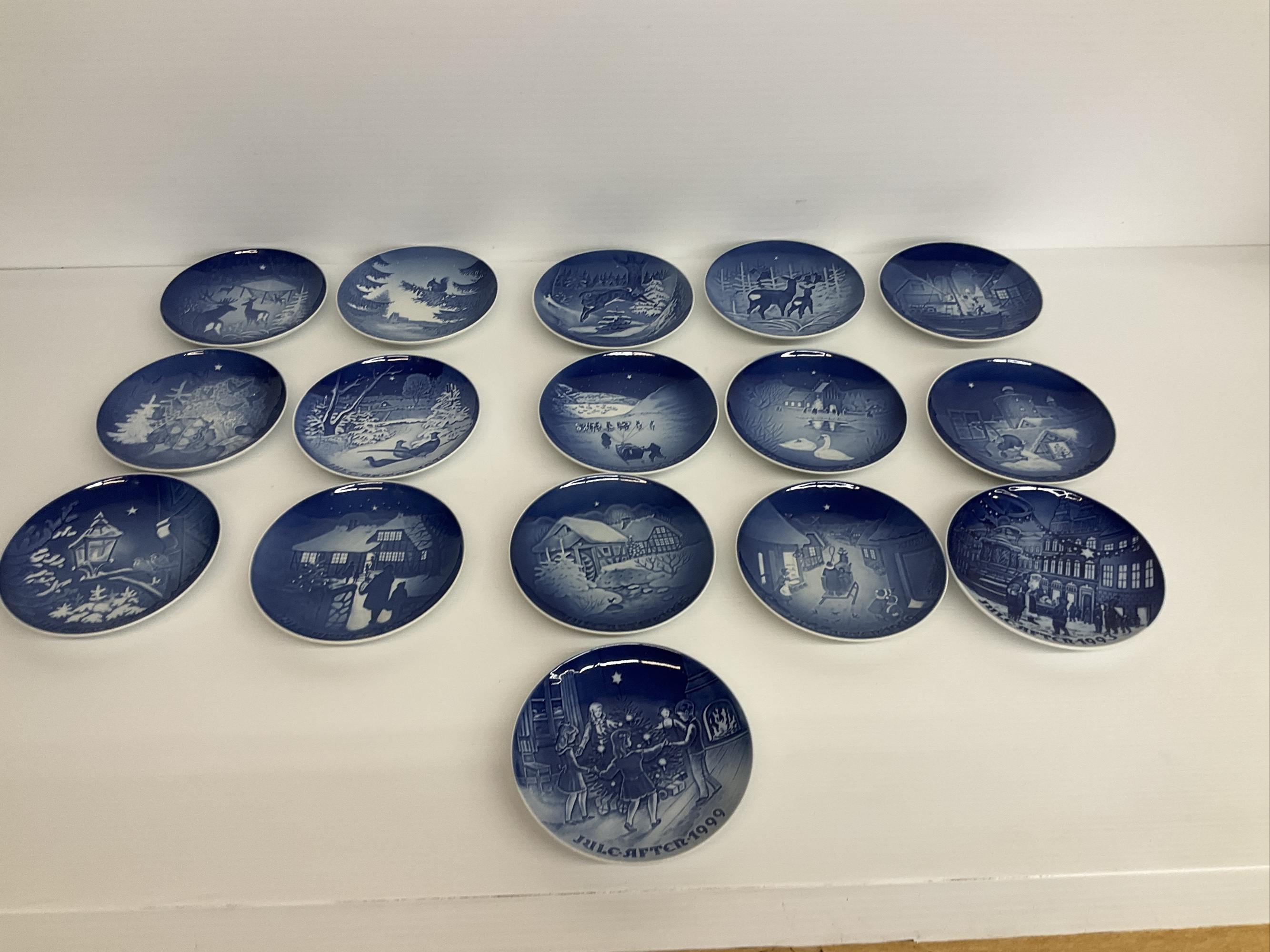 Set of 16 Bing & Grondahl Denmark Christmas plates. Each plate depicts a different Christmas scene and includes the year. Beautiful blue and white coloring. 7 in. dia.