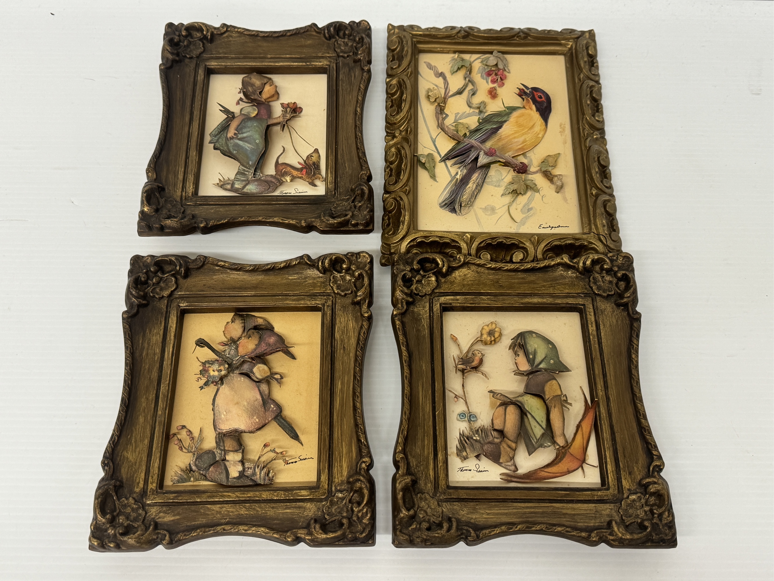 This listing is for a set of four framed relief art prints. These prints feature a unique three-dimensional paper construction and are framed in ornate gilded frames. 6 x 7 in.