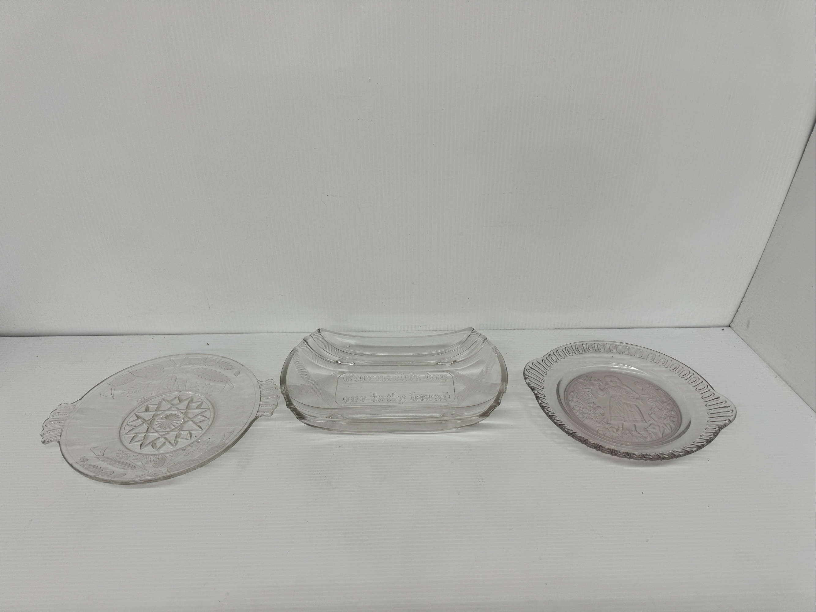 This auction is for a set that includes a clear glass bread dish with the inscription "Give us this day our daily bread." (7 x 12 in.) The set also includes two glass plates with intricate designs (10 in. diameter).