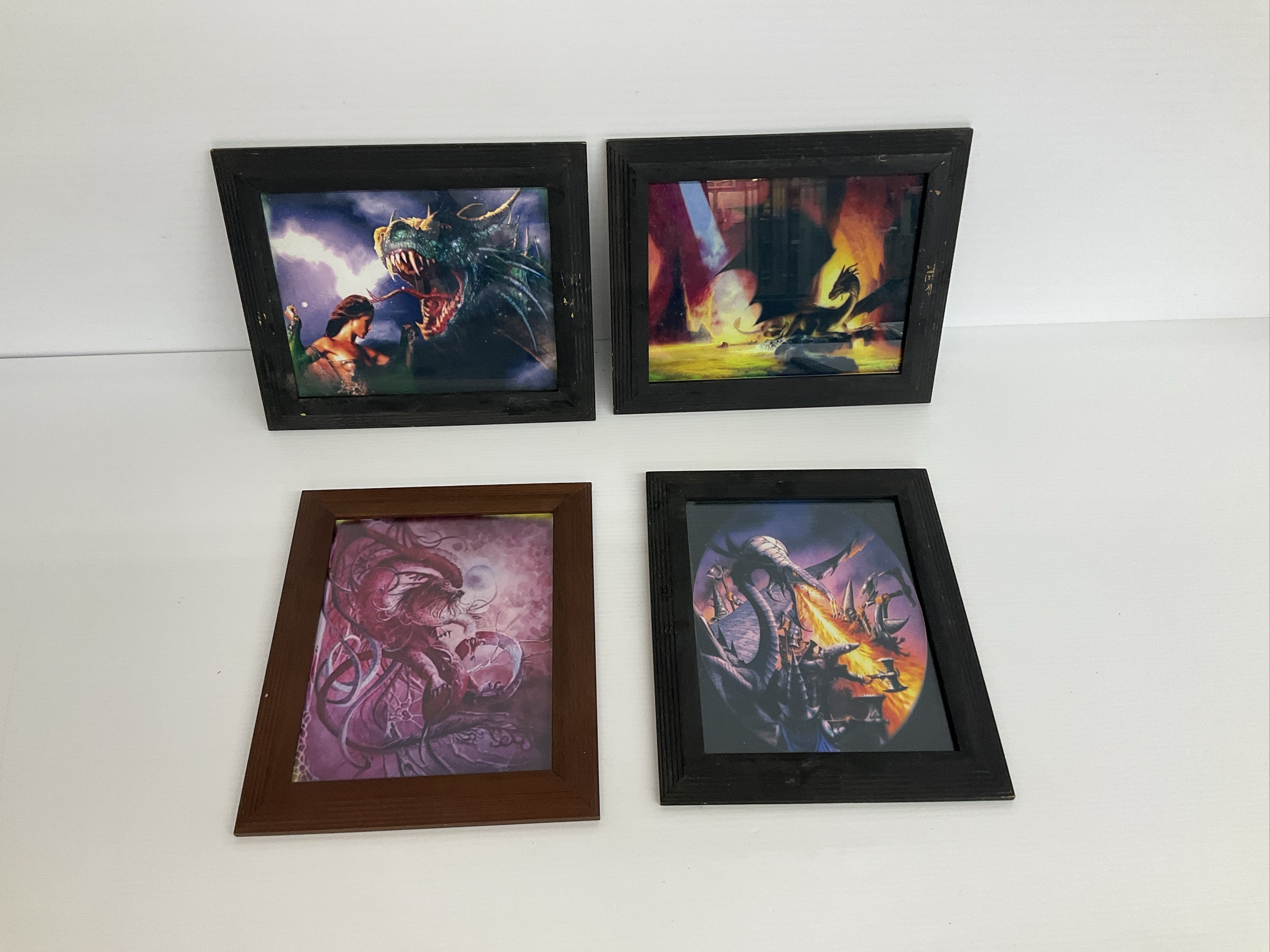 Each print showcases a different fantasy scene involving dragons. The frames are wooden, with two in black and one in brown. 12 x 10 in.