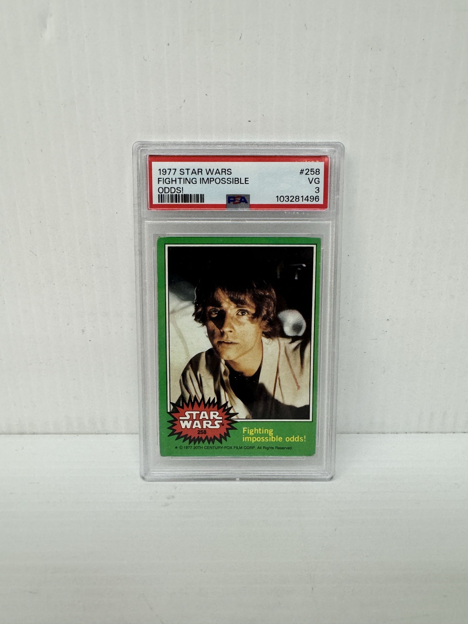 Graded 1977 Star Wars trading card, featuring Fighting Impossible Odds. Graded VG 3 by PSA.