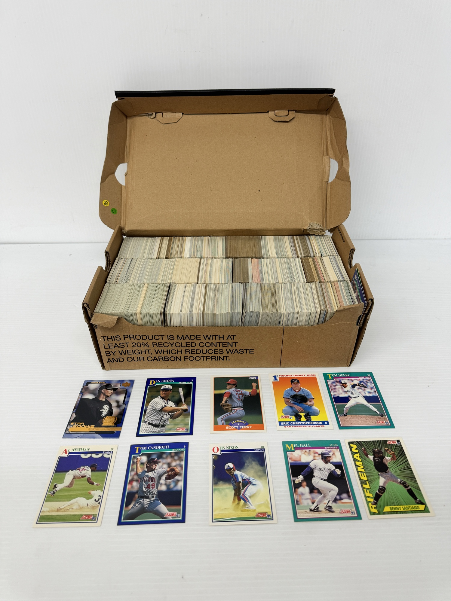 A sizeable collection of baseball trading cards in a cardboard box. Includes various players and teams.