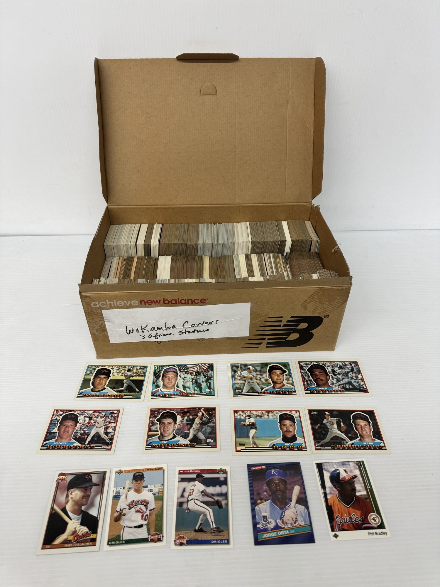 Collection of baseball trading cards. Various players and teams included, stored in a cardboard box.