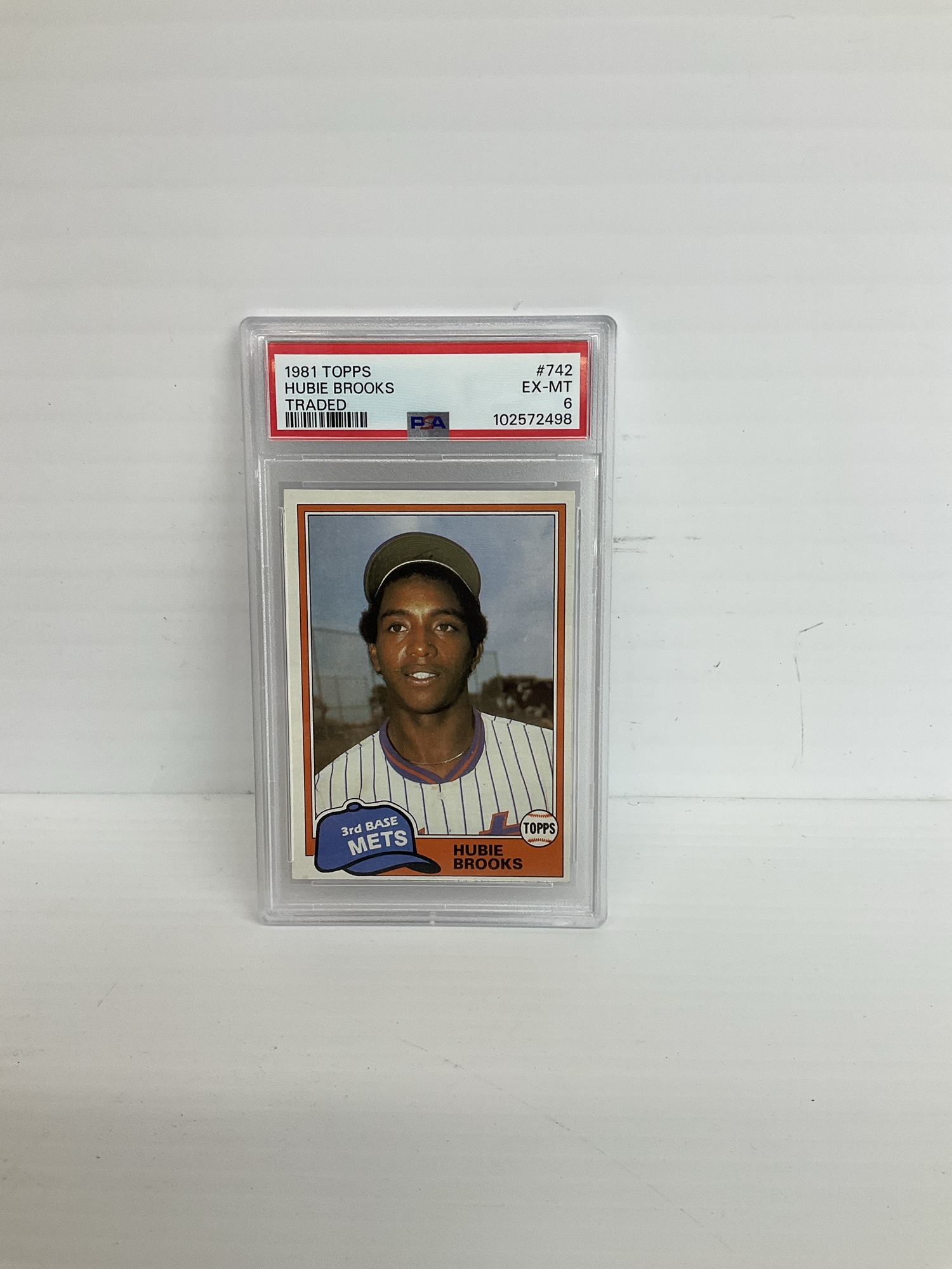 This listing is for a 1981 Topps Hubie Brooks baseball card, graded by PSA. The card features Brooks as a third baseman for the Mets. It showcases his major and minor league batting record.