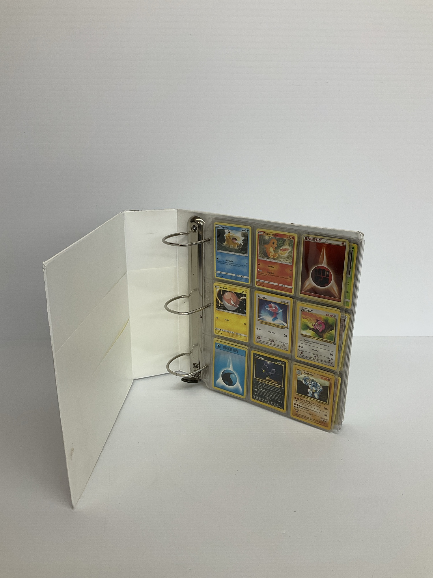 Collection of Pokemon trading cards in a binder. Includes various Pokemon and Energy cards.