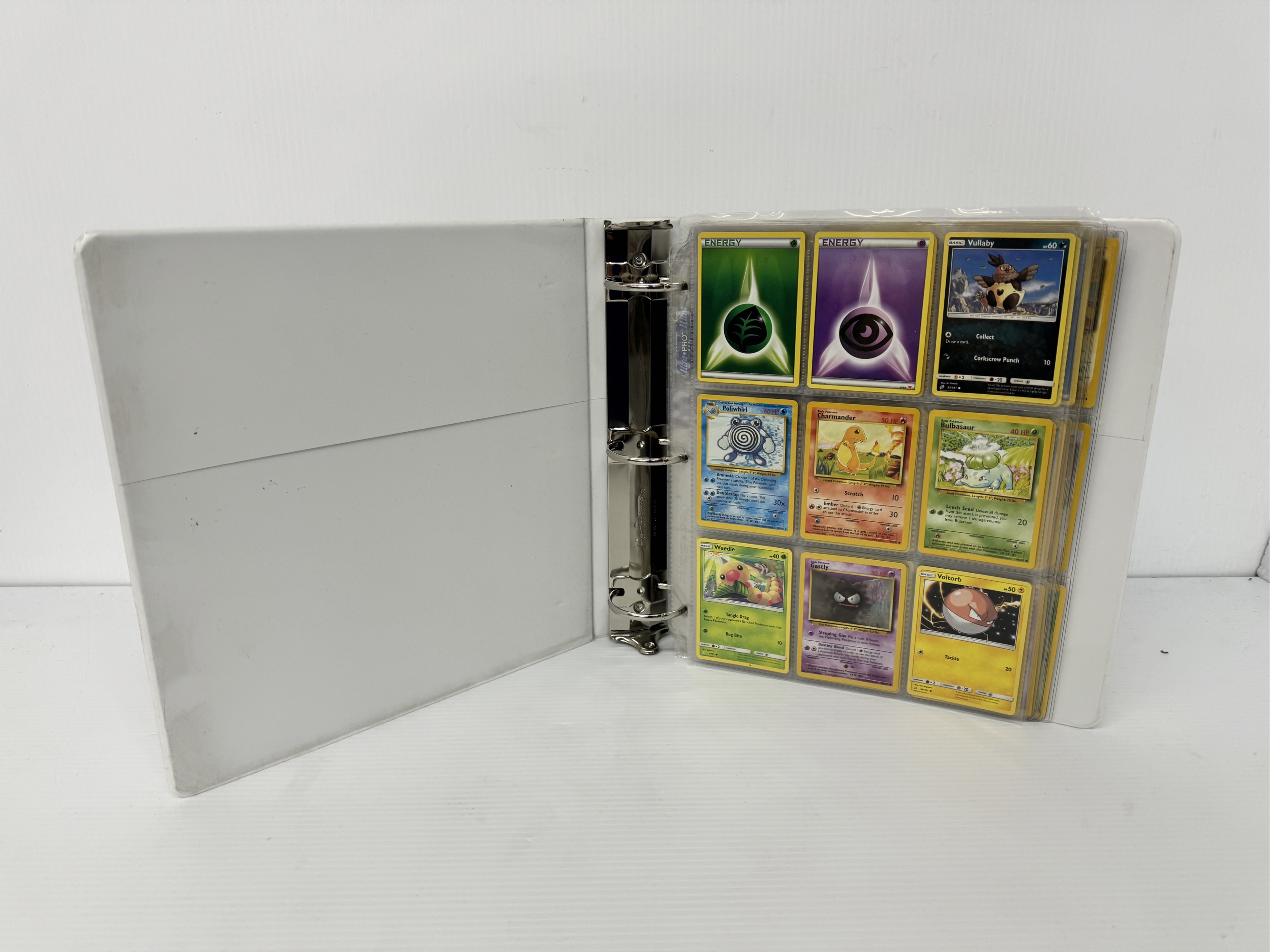 This lot consists of a binder filled with Pokemon cards. The collection includes a variety of Pokemon and energy cards.