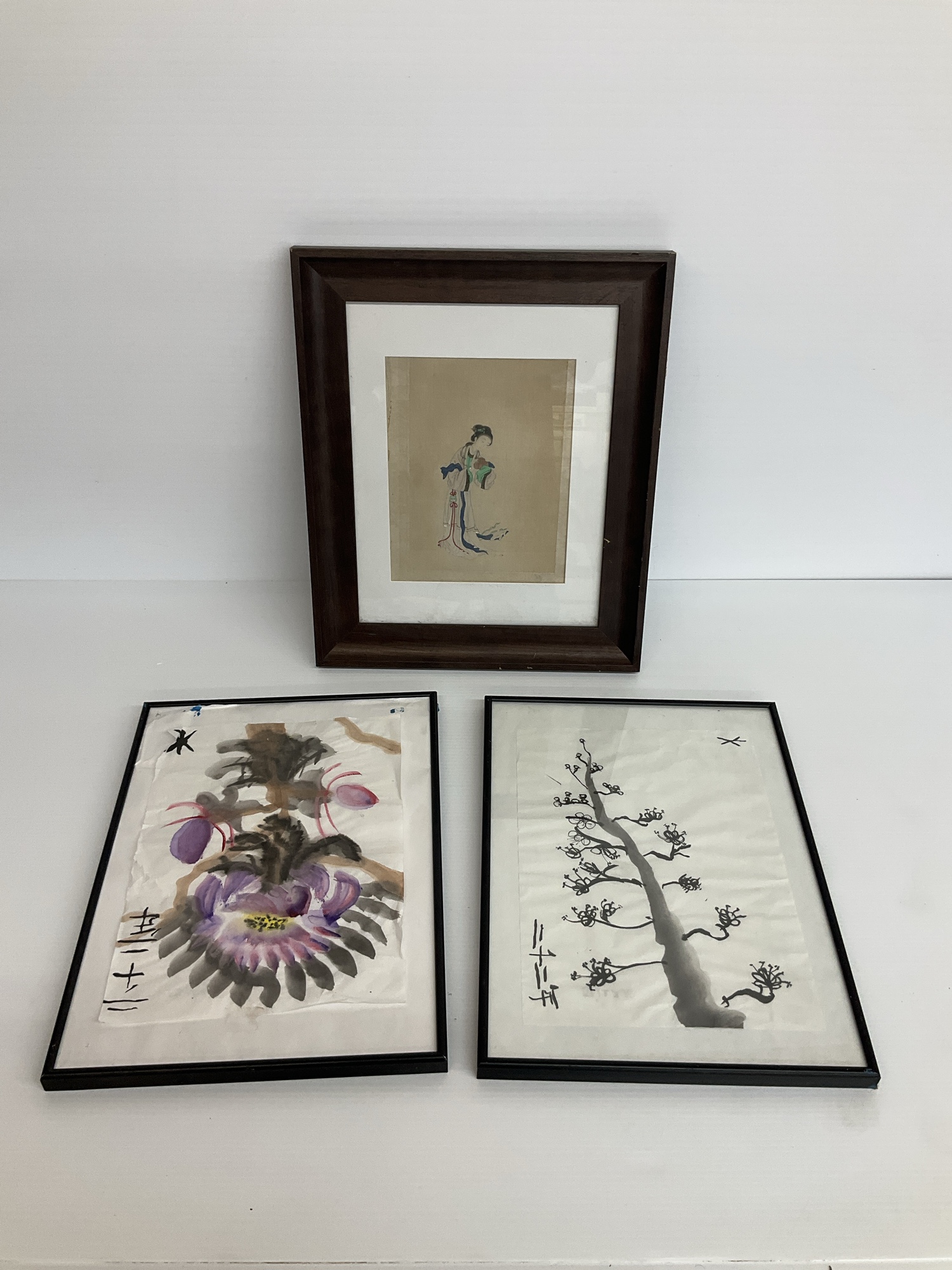 This lot consists of three framed art pieces with Asian-inspired themes. Includes a framed portrait and two paintings featuring flora.