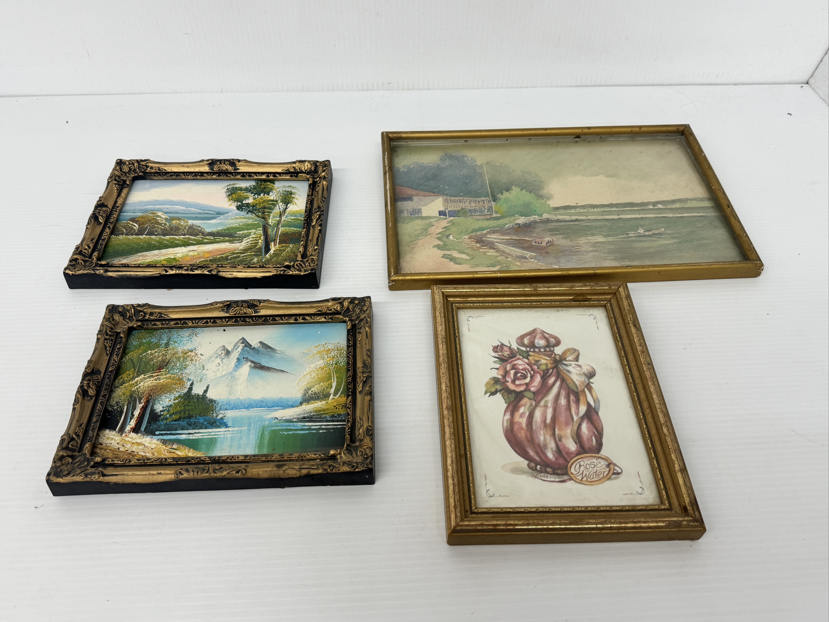 This lot includes four small framed artworks, each featuring a different scene. There are landscapes with trees and mountains, and a picture with a "Rose Water" vase. The frames are ornate and gold in color. Largest 12 x 6 in.