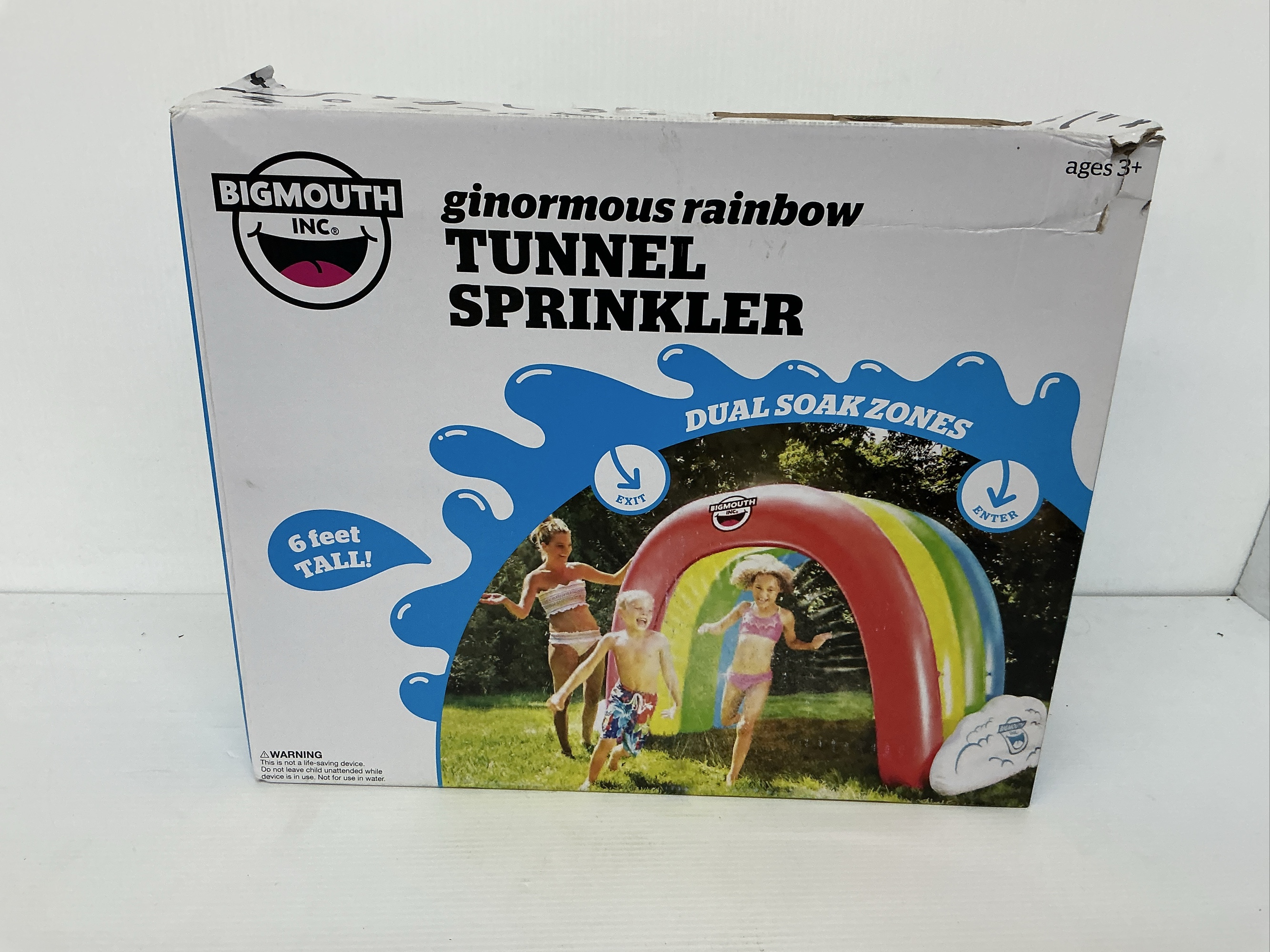 BigMouth Inc. Ginormous Rainbow Tunnel Sprinkler. Inflatable and approximately 6 feet tall. Features dual surround splash soak zones that spray water in 180 degree direction. Includes anchors for secure grounding and inflates to 56 in x 110 in x 75 in. Ages 3+.