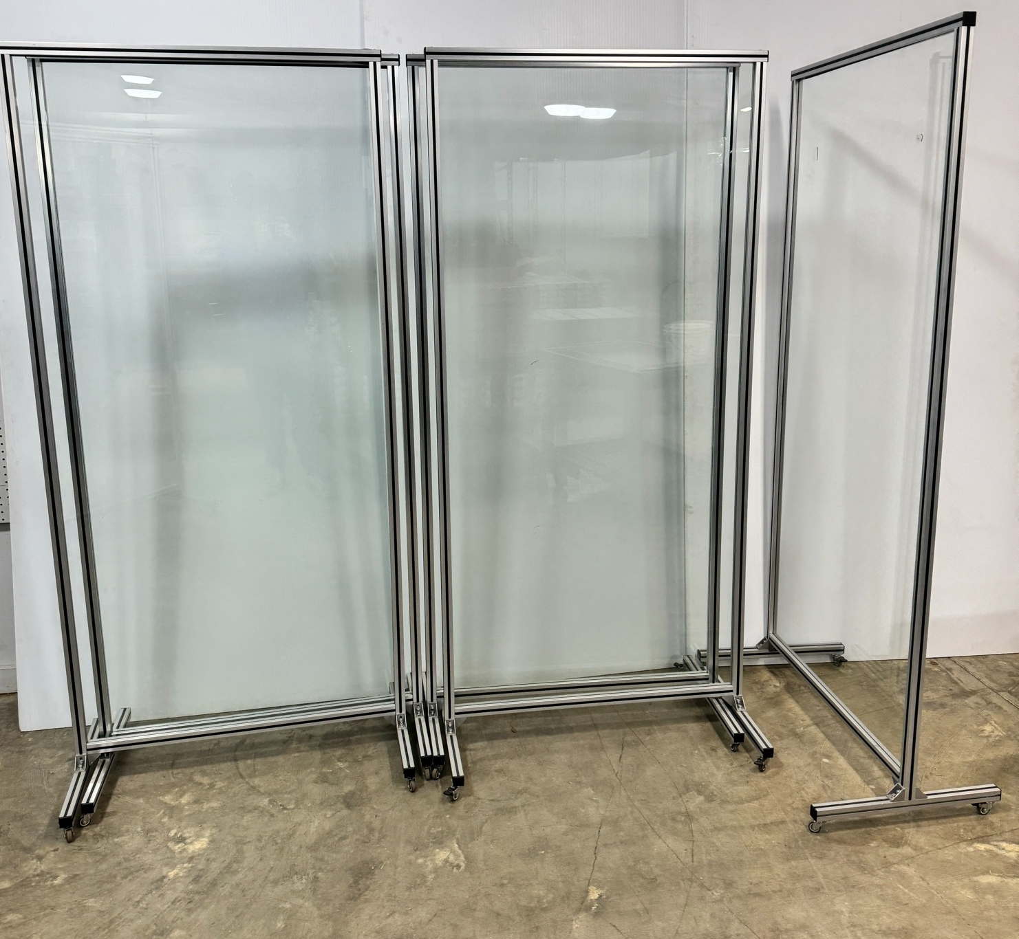 This lot includes five room dividers. Each divider features a sturdy aluminum frame, clear glass panels, and rolling casters for easy mobility. These dividers are ideal for creating private spaces, separating areas in offices or homes, or for use in retail settings. 78 x 36 x 20 in.