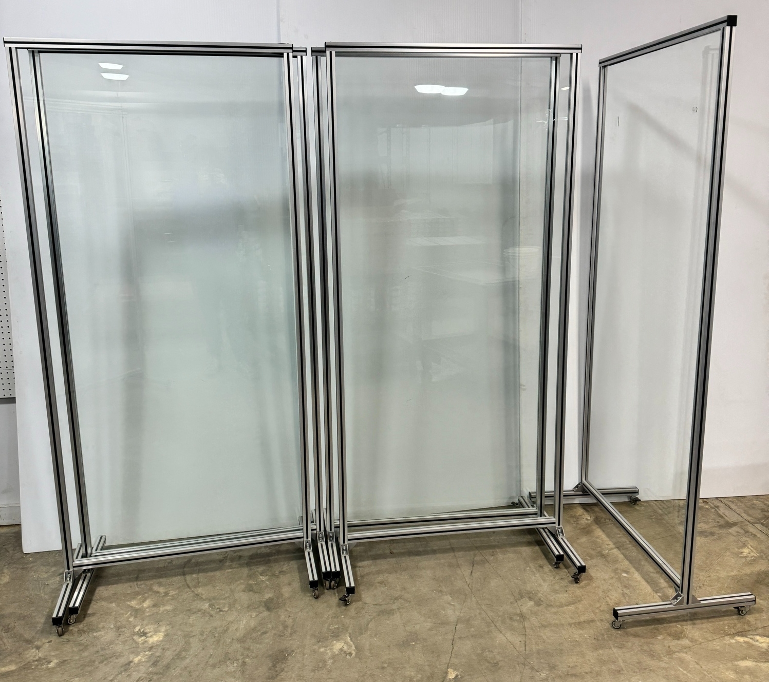 This auction features a set of five portable room divider screens. Each screen is framed in metal and features clear panels. They have a wheeled base for easy maneuverability. 78 x 36 x 20 in.