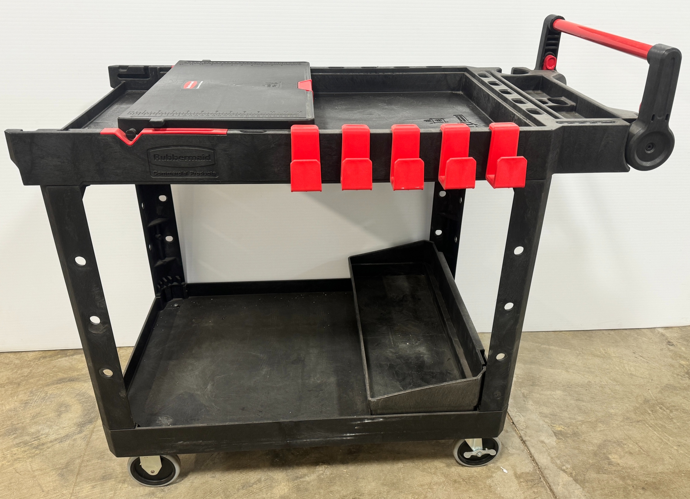 This is a Rubbermaid Commercial Products black tool/utility cart with red accents. It features a top workspace with compartments and a ruler, a bottom storage shelf, and wheels for easy maneuverability. The cart measures 32-3/8" x 22-7/8".