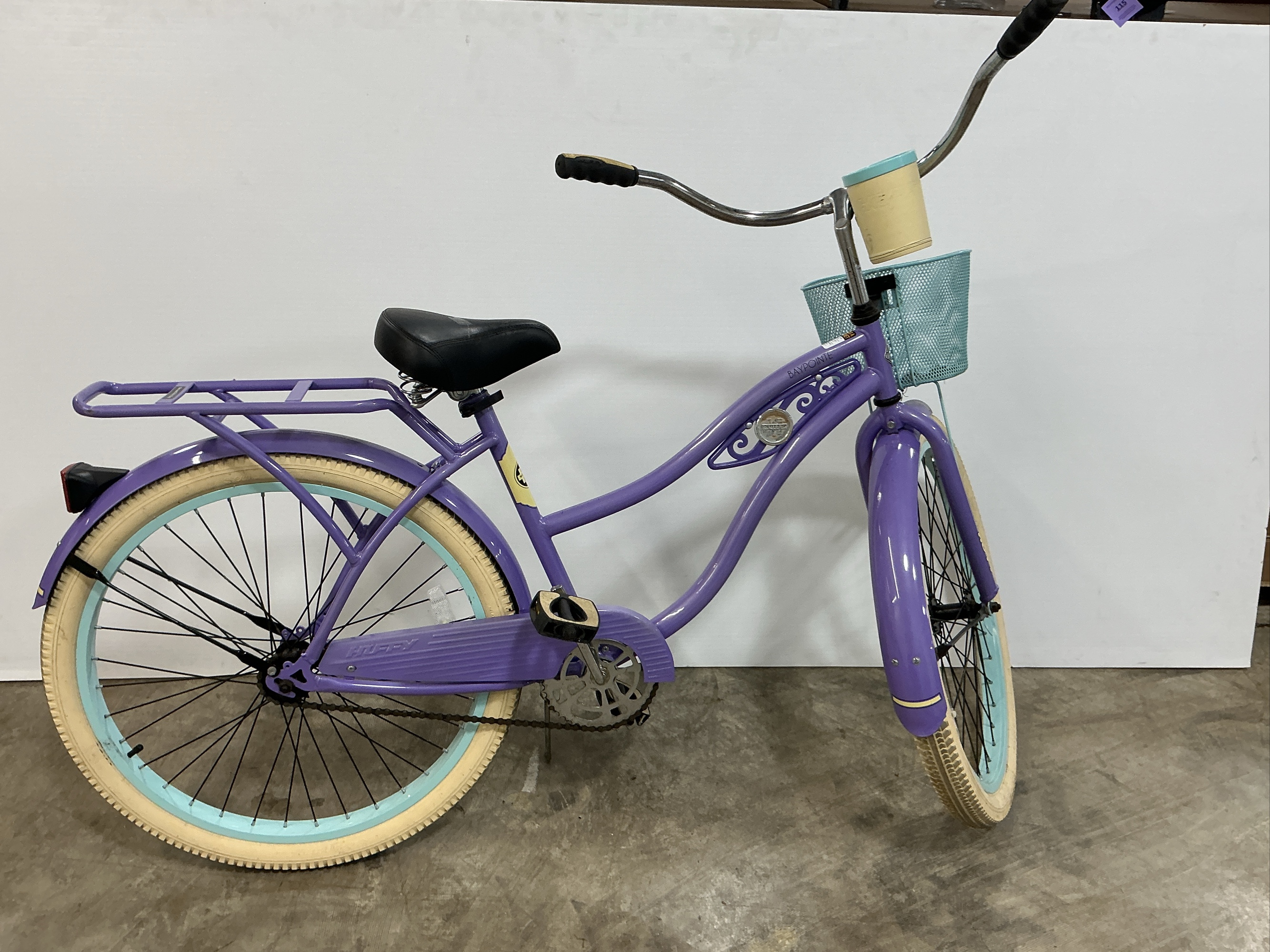 This auction features a Huffy Baypointe cruiser bicycle, finished in a stylish purple color. It's equipped with a front basket and a beverage holder. The bicycle also features a rear rack. A fun and functional ride!